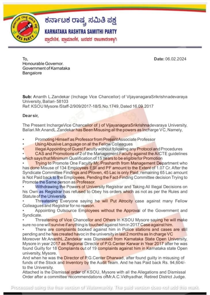 ‘ವಿಎಸ್‌ಕೆಯು ಪ್ರಭಾರ ಕುಲಪತಿ ಅಗಿ ಅಧಿಕಾರ ದುರ್ಬಳಕೆ ಆರೋಪ ಎದುರಿಸುತ್ತಿರುವ ಅನಂತ ಝಂಡೇಕರ ವಿರುದ್ಧ ಉನ್ನತ ಮಟ್ಟದ ವಿಚಾರಣೆ ನಡೆಸಬೇಕು ಎಂದು ಹೇಳಿರುವ ಕೆಆರ್‌ಎಸ್, ಝಂಡೇಕರ್ ಕೆಎಸ್ಒಯು ಕಾರವಾರ ಕೇಂದ್ರದಲ್ಲಿದ್ದಾಗ ನಡೆಸಿದ್ದಾರೆನ್ನಲಾದ ದುರ್ವರ್ತನೆ ಪ್ರಕರಣವನ್ನು ಗಂಭೀರವಾಗಿ ಪರಿಗಣಿಸಬೇಕು,’ ಎಂದು ಶ್ರೀನಿವಾಸ ರೆಡ್ಡಿ ಕೆ ಅವರು ರಾಜ್ಯಪಾಲರಿಗೆ ಕಳಿಸಿರುವ ಪತ್ರದಲ್ಲಿ ಒತ್ತಾಯಿಸಿರುವುದು ತಿಳಿದು ಬಂದಿದೆ.