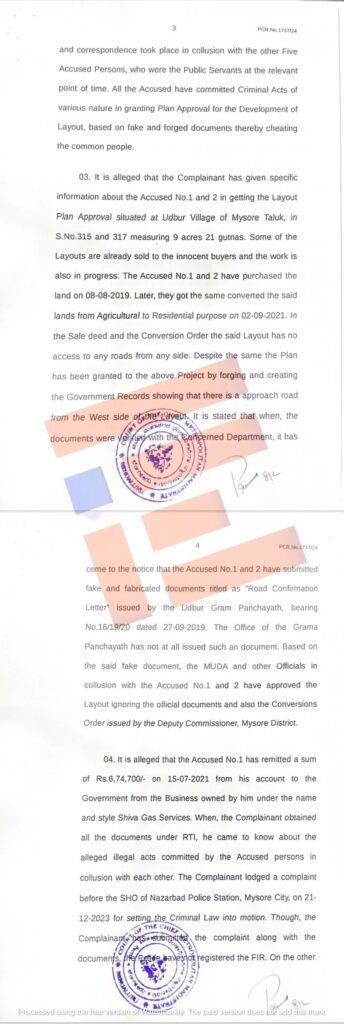 ‘ಅಕ್ರಮವಾಗಿ ಹಣ ಸಂಪಾದಿಸಲು ಕಾನೂನುಬಾಹಿರವಾಗಿ ಲೇಔಟ್ ನಿರ್ಮಾಣ ಮಾಡಲು ಮಾಲೀಕರೊಂದಿಗೆ ಈ ಎಲ್ಲಾ ಅಧಿಕಾರಿಗಳು ಶಾಮೀಲಾಗಿದ್ದಾರೆ. ಅಪರಾಧಿಕ ಒಳಸಂಚು ರೂಪಿಸಿ ಜನರಿಗೆ ಮೋಸ, ವಂಚನೆ ಮಾಡಿ ಅಕ್ರಮವಾಗಿ ಹಣ ಕಬಳಿಸುವ ದುರುದ್ದೇಶ ಹೊಂದಿದ್ದಾರೆ. ಲೇಔಟ್ ನಿರ್ಮಾಣ ಮಾಡಲು ನಕಲು ಮತ್ತು ಸುಳ್ಳು ದಾಖಲೆಗಳನ್ನು ಸೃಷ್ಟಿಸಿರುವುದು ಮತ್ತು ಸರ್ಕಾರದ ದಸ್ತಾವೇಜುಗಳನ್ನು ಖೊಟ್ಟಿಯಾಗಿ ಸೃಷ್ಟಿಸಿ ನಕಲಿ ಲೇಔಟ್ ನಕ್ಷೆ ಹಾಗೂ ಸ್ಕೆಚ್ಗಳನ್ನು ತಯಾರಿಸಿ ಕೋಟ್ಯಂತರ ರುಪಾಯಿಗಳನ್ನು ಸಾರ್ವಜನಿಕರಿಗೆ ಹಾಗೂ ಸರ್ಕಾರಕ್ಕೆ ವಂಚನೆ ಮಾಡಿದ್ದಾರೆ,’ ಎಂದು ದೂರಿನಲ್ಲಿ ವಿವರಿಸಿದ್ದರು.