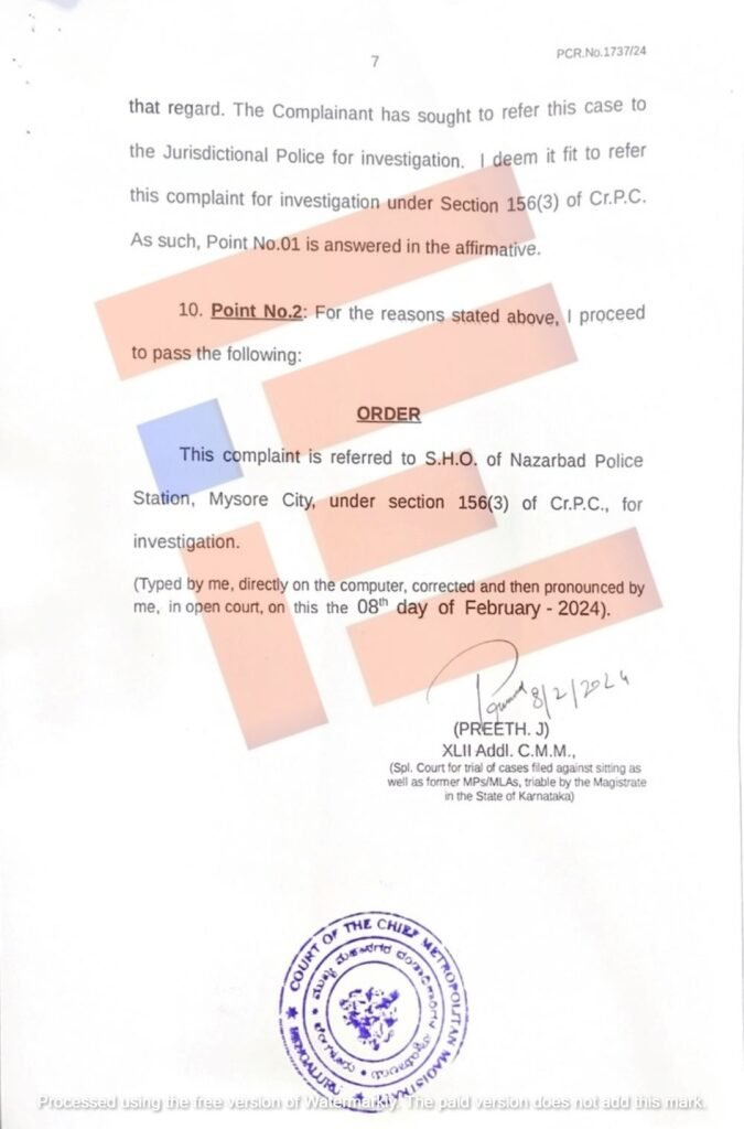ಆದರೆ ಈ ದೂರನ್ನಾಧರಿಸಿ ನಜರಬಾದ್ ಪೊಲೀಸ್ ಠಾಣೆಯಲ್ಲಿ ಎಫ್ಐಆರ್ ದಾಖಲಾಗಿರಲಿಲ್ಲ. ಹೀಗಾಗಿ ರಿಯಲ್ ಎಸ್ಟೇಟ್ ಮತ್ತು ಪ್ರಮಾಣೀಕೃತ ರೇರಾ ಪ್ರತಿನಿಧಿ ಆದೀಶ್ ಸಾಗರ್ ಅವರು ಮಾಜಿ ಶಾಸಕ ಎಂ ಕೆ ಸೋಮಶೇಖರ್, ಎಲ್ ಕುಸುಮಾ, ಸರ್ವೆಯರ್ ಮಾದೇಗೌಡ, ಮೇಲ್ವಿಚಾರಕ ರಮೇಶ್, ಮೈಸೂರು ಅಭಿವೃದ್ಧಿ ಪ್ರಾಧಿಕಾರದ ಅಧಿಕಾರಿಗಳು, ನಿವೃತ್ತ ಅಧಿಕಾರಿ ಮಹಾಂತಪ್ಪ ಅವರ ವಿರುದ್ಧ ಆದೀಶ್ ಸಾಗರ್ ಅವರು ಸಿಆರ್ಪಿಸಿಯ ಸೆಕ್ಷನ್ 156(3) ಅಡಿಯಲ್ಲಿ ಖಾಸಗಿ ದೂರು ಸಲ್ಲಿಸಿದ್ದರು. ಆದೀಶ್ ಸಾಗರ್ ಅವರು ಸಲ್ಲಿಸಿದ್ದ ಖಾಸಗಿ ದೂರನ್ನು ವಿಚಾರಣೆ ನಡೆಸಿದ ನ್ಯಾಯಾಧೀಶರು 2024ರ ಫೆ.8ರಂದು ಈ ಆದೇಶ ಹೊರಡಿಸಿದ್ದರು. ಇದರ ಪ್ರತಿಯು ‘ದಿ ಫೈಲ್’ಗೆ ಲಭ್ಯವಾಗಿದೆ.