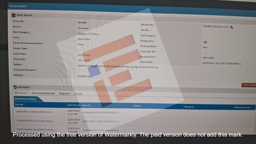 2024ರ ಜನವರಿ 22ರಂದು ಇಲಾಖೆಯ ಉಪ ಕಾರ್ಯದರ್ಶಿ ಉಕೇಶ್ ಕುಮಾರ್ ಬಳಿ ಈ ದೂರನ್ನು (11.47 am) ಪರಿಶೀಲಿಸಿದ್ದಾರೆ. ಅದೇ ದಿನ ಅಧೀನ ಕಾರ್ಯದರ್ಶಿ ಟಿ ಮಹಂತೇಶ್ (12.14 pm) ಅವರ ಬಳಿ ಹೋಗಿದೆ. ಅಂದೇ ಈ ದೂರು ಮುಕ್ತಾಯಗೊಂಡಿರುವುದು ಇ-ಆಫೀಸ್ ಕಡತದಿಂದ ತಿಳಿದು ಬಂದಿದೆ.