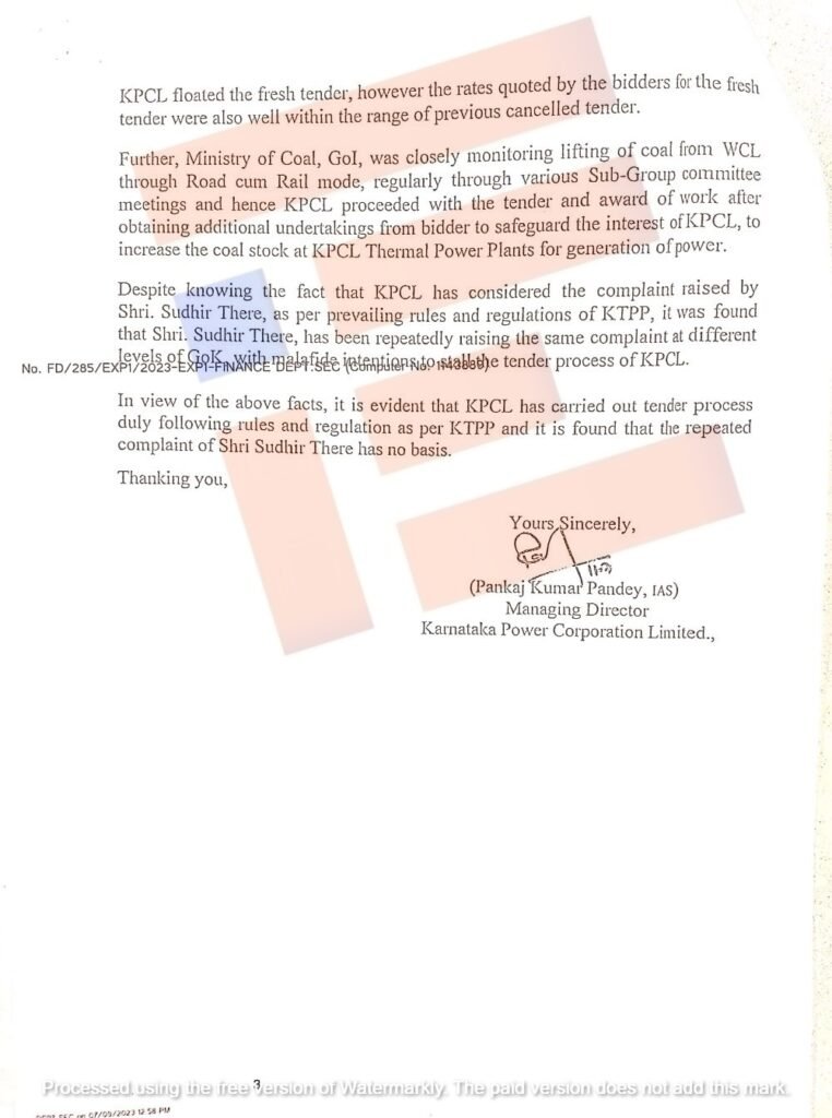 ಆದರೆ ಕರ್ನಾಟಕ ವಿದ್ಯುತ್ ನಿಗಮದ ವ್ಯವಸ್ಥಾಪಕ ನಿರ್ದೇಶಕ ಪಂಕಜ್ಕುಮಾರ್ ಪಾಂಡೆ ಅವರು ಈ ದೂರು ಆಧಾರರಹಿತವಾದದು ಎಂದು ಆರ್ಥಿಕ ಇಲಾಖೆಯ ಸರ್ಕಾರದ ಹೆಚ್ಚುವರಿ ಮುಖ್ಯ ಕಾರ್ಯದರ್ಶಿಗೆ 2023ರ ಜುಲೈ 11ರಂದು ಪತ್ರ ಬರೆದಿದ್ದರು. ಈ ಪತ್ರದ ಪ್ರತಿಯೂ ‘ದಿ ಫೈಲ್’ಗೆ ಲಭ್ಯವಾಗಿದೆ.