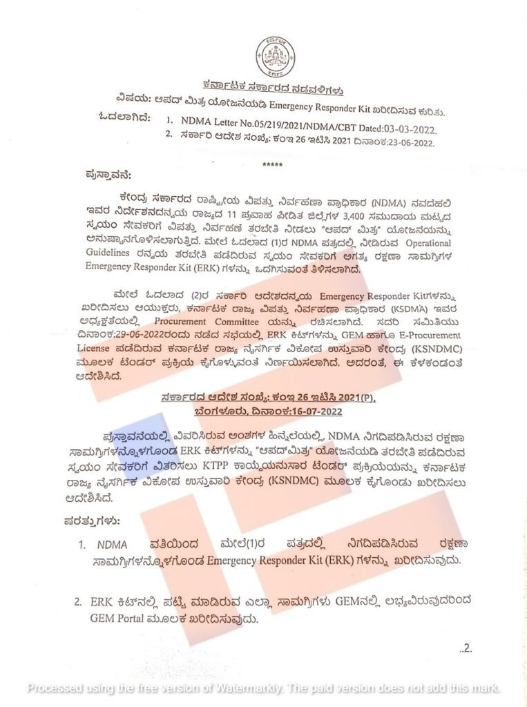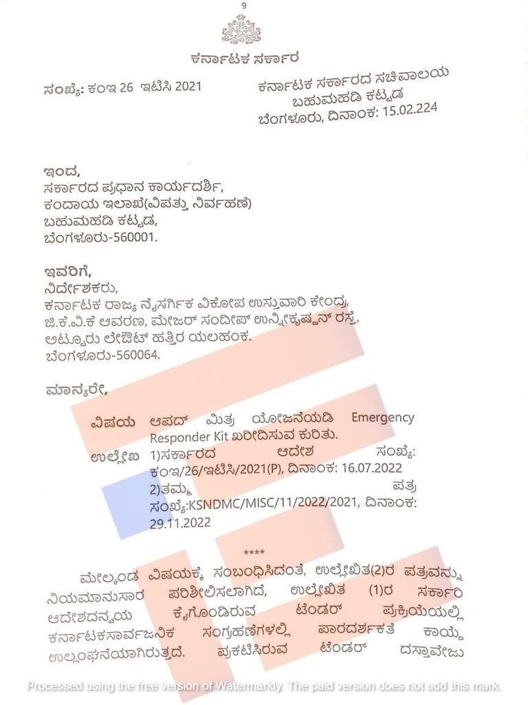 2022ರ ಜೂನ್ 29ರಂದು ನಡೆದಿದ್ದ ಸಭೆಯು ಅಗತ್ಯ ರಕ್ಷಣಾ ಸಾಮಗ್ರಿಗಳ ಕಿಟ್ನ್ನು ಜೆಮ್ ಮತ್ತು ಇ-ಪ್ರೊಕ್ಯೂರ್ಮೆಂಟ್ ಪರವಾನಿಗೆ ಪಡೆದಿರುವ ಕೆಎಸ್ಎನ್ಡಿಎಂಸಿ ಮೂಲಕ ಟೆಂಡರ್ ಪ್ರಕ್ರಿಯೆ ನಡೆಸಲು ನಿರ್ಣಯಿಸಿತ್ತು. ಈ ಸಂಬಂಧ 2022ರ ಜುಲೈ 16ರಂದು ಆದೇಶವನ್ನೂ ಹೊರಡಿಸಿತ್ತು. ಈ ಆದೇಶದ ಪ್ರತಿಯೂ ‘ದಿ ಫೈಲ್’ಗೆ ಲಭ್ಯವಾಗಿದೆ.