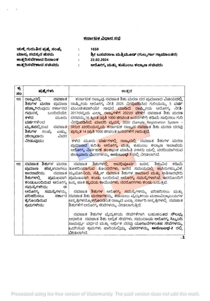 ರಾಜ್ಯದಲ್ಲಿ ಕಳೆದ ನಾಲ್ಕು ವರ್ಷದಲ್ಲಿ 25,032 ನವಜಾತ ಶಿಶುಗಳು ಮರಣ ಹೊಂದಿವೆ ಎಂದು ರಾಜ್ಯ ಸರ್ಕಾರವು ವಿಧಾನಮಂಡಲಕ್ಕೆ ಒದಗಿಸಿರುವ ಮಾಹಿತಿಯು ಆತಂಕಕಾರಿಯಾಗಿದೆ.