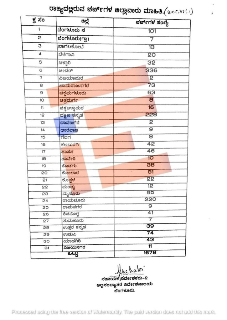 ಬೆಂಗಳೂರು ನಗರ ಉತ್ತರದಲ್ಲಿ 150, ಬೆಂಗಳೂರು ದಕ್ಷಿಣ 108, ಬೆಂಗಳೂರು ಗ್ರಾಮೀಣದಲ್ಲಿ 50, ಚಿಕ್ಕಬಳ್ಳಾಪುರದಲ್ಲಿ 58, ಚಿತ್ರದುರ್ಗದಲ್ಲಿ 28, ದಾವಣಗೆರೆಯಲ್ಲಿ 24, ಕೋಲಾರದಲ್ಲಿ 15, ರಾಮನಗರದಲ್ಲಿ 35, ಶಿವಮೊಗ್ಗದಲ್ಲಿ 26, ತುಮಕೂರಿನಲ್ಲಿ 43, ಬೆಳಗಾವಿಇಯಲ್ಲಿ 68, ಬಾಗಲಕೋಟೆಯಲ್ಲಿ 68, ಚಿಕ್ಕೋಡಿಯಲ್ಲಿ 7, ಧಾರವಾಡದಲ್ಲಿ 58, ಗದಗ್ನಲ್ಲಿ 9, ಹಾವೇರಿಯಲ್ಲಿ 3, ಉತ್ತರ ಕನ್ನಡದಲ್ಲಿ 15, ವಿಜಯಪುರದಲ್ಲಿ 5, ಕಲ್ಬುರ್ಗಿಯಲ್ಲಿ 58, ಬಳ್ಳಾರಿ (ವಿಜಯನಗರ)ದಲ್ಲಿ 26, ಬೀದರ್ನಲ್ಲಿ 6, ಕೊಪ್ಪಳದಲ್ಲಿ 28, ರಾಯಚೂರಿನಲ್ಲಿ 15, ಯಾದಗಿರಿಯಲ್ಲಿ 14, ಮೈಸೂರಿನಲ್ಲಿ 25, ಚಾಮರಾಜನಗರದಲ್ಲಿ 21, ಚಿಕ್ಕಮಗಳೂರಿನಲ್ಲಿ 17, ದಕ್ಷಿಣ ಕನ್ನಡದಲ್ಲಿ 17, ಹಾಸನದಲ್ಲಿ 20, ಕೊಡಗಿನಲ್ಲಿ 1, ಮಂಡ್ಯದಲ್ಲಿ 7, ಉಡುಪಿಯಲ್ಲಿ 29 ಮಸೀದಿ, ಚರ್ಚ್ಗಳು ನೋಂದಣಿಯಾಗಿಲ್ಲ ಎಂದು ಅಂಕಿ ಅಂಶಗಳನ್ನು ಒದಗಿಸಿದ್ದಾರೆ.