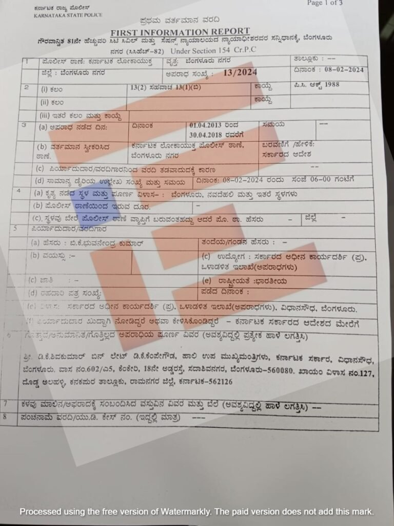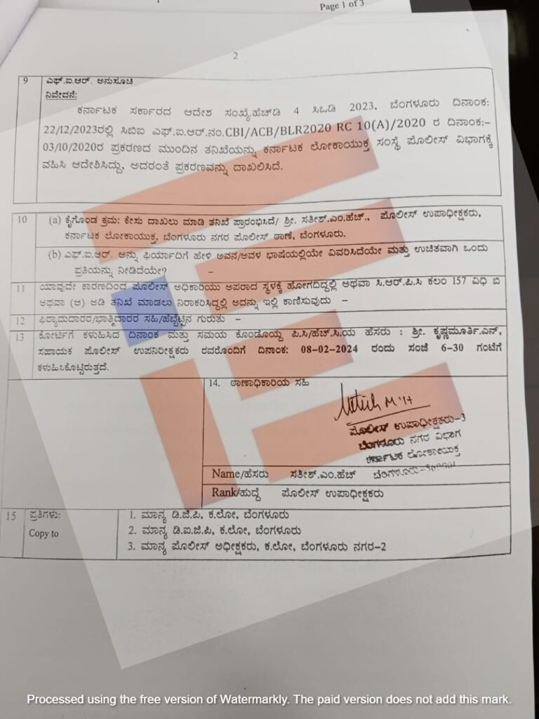 ಈ ಸಂಬಂಧ ಎಫ್ಐಆರ್ ಸೇರಿದಂತೆ ಯಾವುದೇ ಕ್ರಮವನ್ನು ಕೈಗೊಳ್ಳದ ಲೋಕಾಯುಕ್ತ ಪೊಲೀಸರು ಅಳೆದು ತೂಗಿ ತಿಂಗಳ ನಂತರ ಎಫ್ಐಆರ್ ದಾಖಲಿಸಿದ್ದಾರೆ.