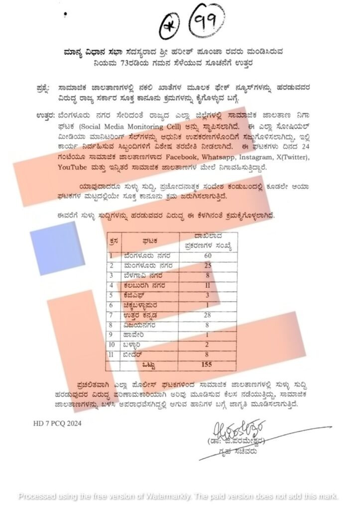 ಆದರೆ ರಾಜ್ಯದಲ್ಲಿ ಈಗಾಗಲೇ ಸಾಮಾಜಿಕ ಜಾಲತಾಣ ನಿಗಾ ಘಟಕಗಳು ಕಾರ್ಯನಿರ್ವಹಿಸುತ್ತಿವೆ ಎಂದು ಗೃಹ ಸಚಿವ ಡಾ ಜಿ ಪರಮೇಶ್ವರ್‍‌ ಅವರು ವಿಧಾನಸಭೆಗೆ ಉತ್ತರ ನೀಡಿದ್ದಾರೆ.  ಸಾಮಾಜಿಕ ಜಾಲತಾಣಗಳಲ್ಲಿ ನಕಲಿ ಖಾತೆಗಳ ಮೂಲಕ ಫೇಕ್‌ ನ್ಯೂಸ್‌ಗಳನ್ನು ಹರಡುವವರ ವಿರುದ್ಧ ರಾಜ್ಯ ಸರ್ಕಾರವು ಸೂಕ್ತ ಕಾನೂನು ಕ್ರಮ ಕೈಗೊಳ್ಳುವ ಬಗ್ಗೆ ಶಾಸಕ ಹರೀಶ್‌ ಪೂಂಜಾ ಅವರು ನಿಯಮ 73 ಅಡಿಯಲ್ಲಿ ಗಮನ ಸೆಳೆಯುವ ಸೂಚನೆ ಮಂಡಿಸಿದ್ದರು.