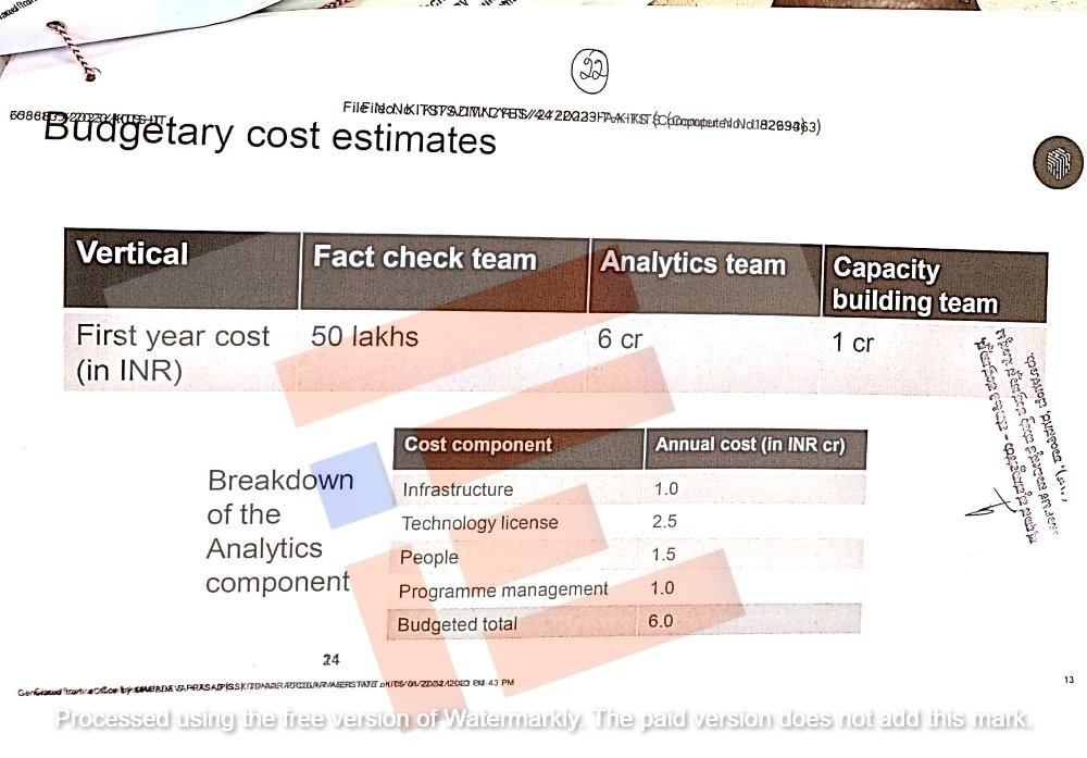 ಫ್ಯಾಕ್ಟ್‌ ಚೆಕ್‌ ತಂಡಕ್ಕೆ ವಾರ್ಷಿಕ 50 ಲಕ್ಷ, ವಿಶ್ಲೇಷಣೆ ತಂಡಕ್ಕೆ 6 ಕೋಟಿ ಮತ್ತು ಮೂಲ ಸೌಕರ್ಯಕ್ಕೆ 1 ಕೋಟಿ ರು. ಎಂದು ವೆಚ್ಚದ ಪ್ರಸ್ತಾವನೆ ಸರ್ಕಾರದ ಮುಂದಿದೆ. ಅದೇ ರೀತಿ ವಿಶ್ಲೇಷಣೆ ತಂಡಕ್ಕೆ ಮೂಲ ಸೌಕರ್ಯಗಳಿಗೆ 1 ಕೋಟಿ, ತಾಂತ್ರಿಕ ಪರವಾನಗಿಗೆ 2.5 ಕೋಟಿ ರು., ಮಾನವ ಸಂಪನ್ಮೂಲಕ್ಕೆ 1.5ಕೋಟಿ, ಕಾರ್ಯಕ್ರಮಗಳ ನಿರ್ವಹಣೆಗಾಗಿ 1.0 ಕೋಟಿ ರು. ಎಂದು ವೆಚ್ಚದ ಪ್ರಸ್ತಾವನೆಯಲ್ಲಿರುವುದು ಗೊತ್ತಾಗಿದೆ.