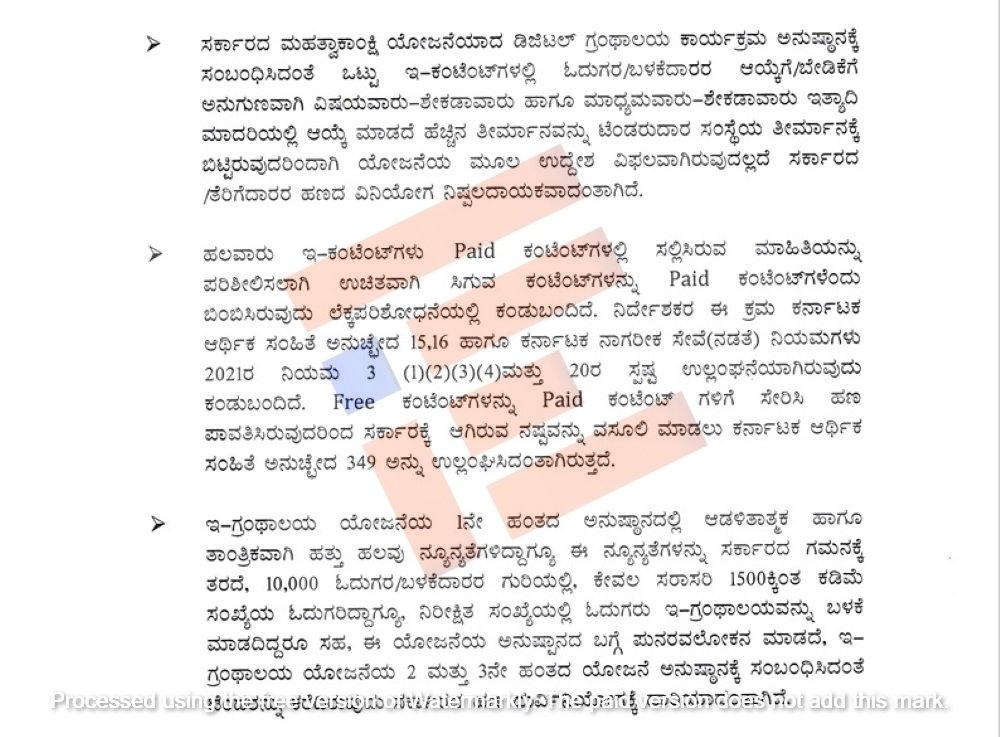 ಇ-ಗ್ರಂಥಾಲಯ ಯೋಜನೆಯ 2 ಮತ್ತು ಮೂರನೇ ಹಂತದ ಯೋಜನೆ ಅನುಷ್ಠಾನಕ್ಕೆ ಸಂಬಂಧಿಸಿದಂತೆ ಟೆಂಡರ್ನ್ನು ಕರೆದಿರುವುದು ಸರ್ಕಾರದ ಹಣ ದುರ್ವಿನಿಯೋಗಕ್ಕೆ ದಾರಿಯಾಗಿರುವುದು ವರದಿಯಿಂದ ಗೊತ್ತಾಗಿದೆ.