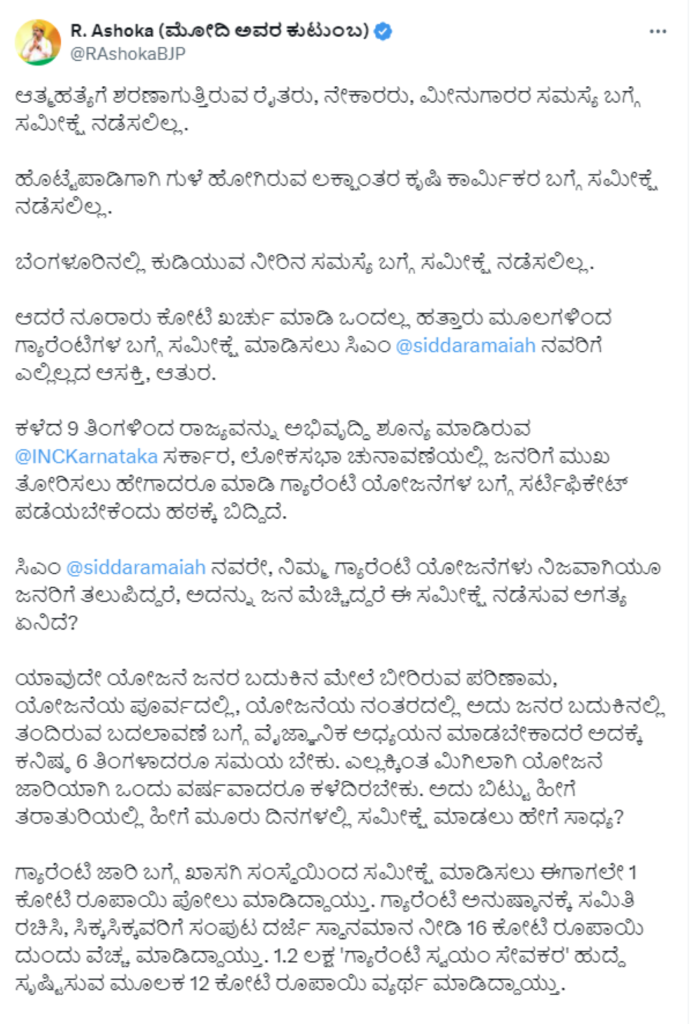 ಆತ್ಮಹತ್ಯೆಗೆ ಶರಣಾಗುತ್ತಿರುವ ರೈತರು, ನೇಕಾರರು, ಮೀನುಗಾರರ ಸಮಸ್ಯೆ ಬಗ್ಗೆ ಸಮೀಕ್ಷೆ ನಡೆಸಲಿಲ್ಲ. ಹೊಟ್ಟೆಪಾಡಿಗಾಗಿ ಗುಳೆ ಹೋಗಿರುವ ಲಕ್ಷಾಂತರ ಕೃಷಿ ಕಾರ್ಮಿಕರ ಬಗ್ಗೆ ಸಮೀಕ್ಷೆ ನಡೆಸಲಿಲ್ಲ. ಬೆಂಗಳೂರಿನಲ್ಲಿ ಕುಡಿಯುವ ನೀರಿನ ಸಮಸ್ಯೆ ಬಗ್ಗೆ ಸಮೀಕ್ಷೆ ನಡೆಸಲಿಲ್ಲ. ಆದರೆ ನೂರಾರು ಕೋಟಿ ಖರ್ಚು ಮಾಡಿ ಒಂದಲ್ಲ ಹತ್ತಾರು ಮೂಲಗಳಿಂದ ಗ್ಯಾರಂಟಿಗಳ ಬಗ್ಗೆ ಸಮೀಕ್ಷೆ ಮಾಡಿಸಲು ಸಿಎಂ ಸಿದ್ದರಾಮಯ್ಯನವರಿಗೆ ಎಲ್ಲಿಲ್ಲದ ಆಸಕ್ತಿ, ಆತುರ. ಕಳೆದ 9 ತಿಂಗಳಿಂದ ರಾಜ್ಯವನ್ನು ಅಭಿವೃದ್ಧಿ ಶೂನ್ಯ ಮಾಡಿರುವ ಕಾಂಗ್ರೆಸ್ ಸರ್ಕಾರ, ಲೋಕಸಭಾ ಚುನಾವಣೆಯಲ್ಲಿ ಜನರಿಗೆ ಮುಖ ತೋರಿಸಲು ಹೇಗಾದರೂ ಮಾಡಿ ಗ್ಯಾರೆಂಟಿ ಯೋಜನೆಗಳ ಬಗ್ಗೆ ಸರ್ಟಿಫಿಕೇಟ್ ಪಡೆಯಬೇಕೆಂದು ಹಠಕ್ಕೆ ಬಿದ್ದಿದೆ ಎಂದು ಎಕ್ಸ್ ಖಾತೆಯಲ್ಲಿ ಕುಟುಕಿದ್ದಾರೆ.