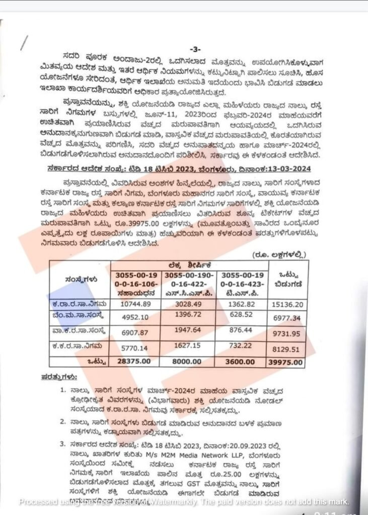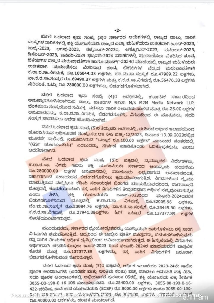 2023-24ನೇ ಸಾಲಿನ ಪೂರಕ ಅಂದಾಜುಗಳು (ಎರಡು ಮತ್ತು ಅಂತಿಮ ಕಂತು) ವೆಚ್ಚ ಮಾಡಲು ಅನುಮತಿ ಪತ್ರ ನೀಡಿತ್ತು. ಪೂರಕ ಅಂದಾಜುಗಳಲ್ಲಿ ಅಭಿಯಾಚನೆ ಕ್ರಮಾಂಕ 05ರಲ್ಲಿ ಶಕ್ತಿ ಯೋಜನೆಯ ಲೆಕ್ಕ ಶೀರ್ಷಿಕೆ (3055-00-190-0-16-106) ಸಹಾಯಧನದಡಿ 284.00.00 ಕೋಟಿ ರು., ಮತ್ತು ಪರಿಶಿಷ್ಟ ಜಾತಿ ಉಪ ಯೋಜನೆಯಡಿ 80.00 ಕೋಟಿ, ಗಿರಿಜನ ಉಪಯೋಜನೆಯಡಿ 36.00 ಕೋಟಿ ಸೇರಿದಂತೆ 400.00 ಕೋಟಿ ರು. ಗಳನ್ನು ಹಂಚಿಕೆ ಮಾಡಲಾಗಿದೆ.