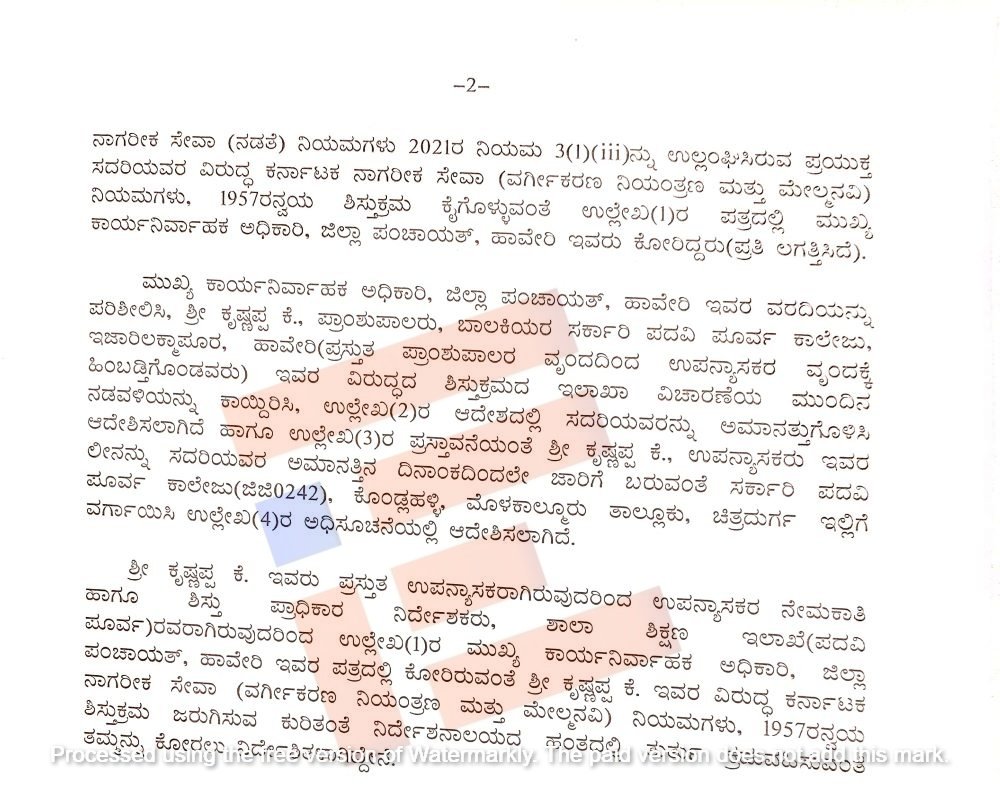 ಈ ಮೂಲಕ ತಮ್ಮ ಕರ್ತವ್ಯ ನಿರ್ವಹಣೆಯಲ್ಲಿನ ಜವಾಬ್ದಾರಿಯನ್ನು ಅರಿತು ಕರ್ತವ್ಯ ನಿರ್ವಹಿಸದೇ ತೀವ್ರ ಸ್ವರೂಪದ ಕರ್ತವ್ಯಲೋಪವೆಸಗಿದ್ದಾರೆ. ಸರ್ಕಾರಿ ನೌಕರರಿಗೆ ತರವಲ್ಲದ ರೀತಿಯಲ್ಲಿ ವರ್ತಿಸಿ ಕರ್ನಾಟಕ ನಾಗರಿಕ ಸೇವಾ ನಿಯಮಗಳ ಅನ್ವಯ ಶಿಸ್ತು ಕ್ರಮ ಕೈಗೊಳ್ಳಬೇಕು ಎಂದು ಕೋರಿದ್ದರು.