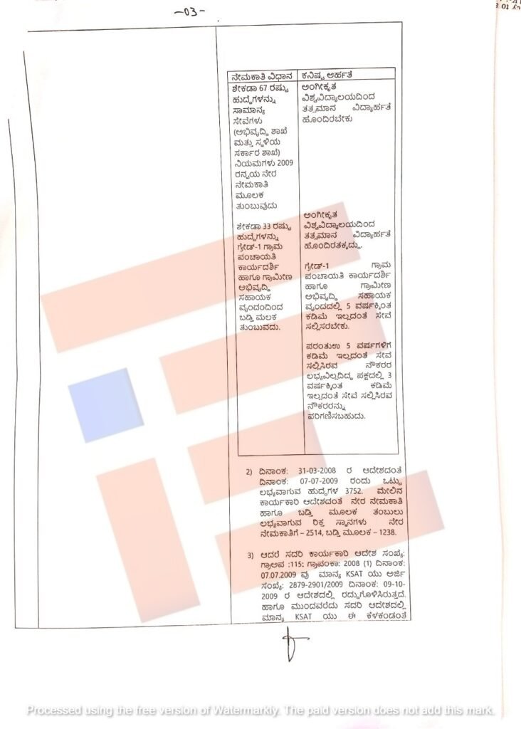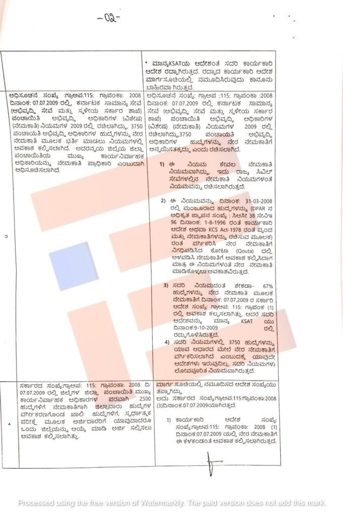 3,750 ಪಂಚಾಯ್ತಿ ಅಭಿವೃದ್ಧಿ ಅಧಿಕಾರಿಗಳ ಹುದ್ದೆಗಳನ್ನು ನೇರ ನೇಮಕಾತಿಗೆ ಅನ್ವಯಿಸಬೇಕು ಎಂದು 2009ರ ಜುಲೈ 7ರಲ್ಲಿ ಹೊರಡಿಸಿರುವ ನಿಯಮಗಳನ್ನು ಜಾರಿಗೆ ತಂದಿದೆ. ಆದರೆ ಈ ನಿಯಮಗಳಲ್ಲಿ ಎಲ್ಲಿಯೂ ನೇರ ನೇಮಕಾತಿ ಮೂಲಕ ಭರ್ತಿ ಮಾಡಲು ನಿಯಮಗಳಲ್ಲಿ ಅವಕಾಶ ಕಲ್ಪಿಸಲಾಗಿದೆ ಎಂದು ನಮೂದಾಗಿಲ್ಲ.