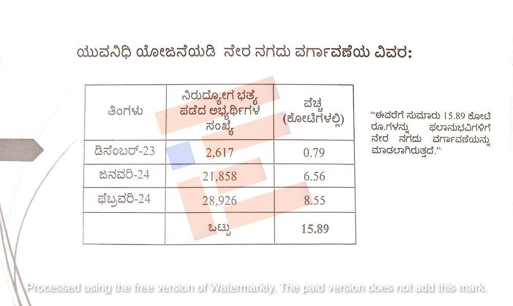 2023ರ ಡಿಸೆಂಬರ್ ಅಂತ್ಯಕ್ಕೆ 2,617 ಅಭ್ಯರ್ಥಿಗಳು 0.79 ಕೋಟಿ ರು., ಜನವರಿ 2024ರಲ್ಲಿ 21,858 ಅಭ್ಯರ್ಥಿಗಳು 6.56 ಕೋಟಿ ರು., ಫೆಬ್ರುವರಿಯ್ಲಿ 28,926 ಅಭ್ಯರ್ಥಿಗಳು 8.55 ಕೋಟಿ ರು ಸೇರಿ ಒಟ್ಟಾರೆ 15.89 ಕೋಟಿ ರು.ಮೊತ್ತದ ನಿರುದ್ಯೋಗ ಭತ್ಯೆ ಪಡೆದಿರುವುದು ಗೊತ್ತಾಗಿದೆ.