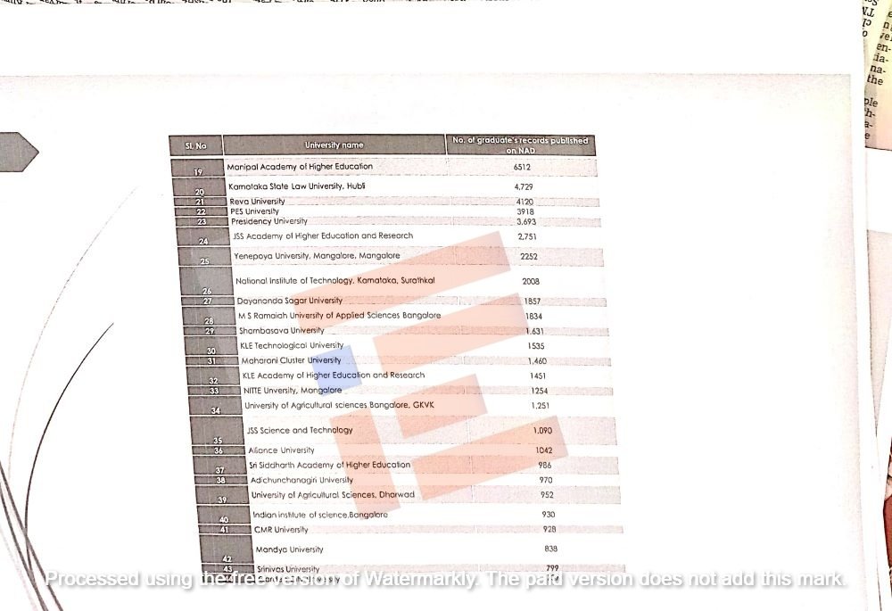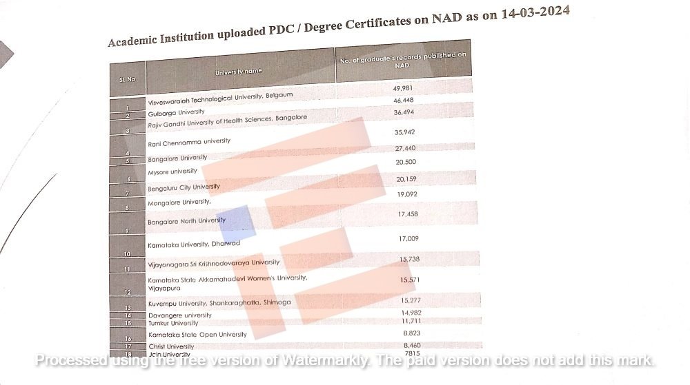 ಹಾಗೆಯೇ ಬಾಗಲಕೋಟೆಯ ತೋಟಗಾರಿಕೆ ವಿವಿಯಲ್ಲಿ 663, ಪಶುವೈದ್ಯಕೀಯ ಮೀನುಗಾರಿಕೆ ವಿವಿಯ 55, ನೃಪತುಂಗ ವಿವಿ 510, ಕೇಂದ್ರೀಯ ವಿವಿ 508, ಸಂಸ್ಕೃತ ವಿವಿ 507, ಅಜೀಂ ಪ್ರೇಮ್ ಜಿ ವಿವಿ 506, ಶಿವಮೊಗ್ಗ ಕೃಷಿ ವಿವಿ 496, ಖ್ವಾಜಾ ಬಂದೇ ನವಾಜ್ ವಿವಿ 411, ದೇವರಾಜ ಅರಸ್ ಅಕಾಡೆಮಿ ಆಫ್ ಹೈಯರ್ ಎಜುಕೇಷನ್ 400, ಬಿಎಲ್ಡಿಇ ವಿವಿ 356, ಬೆಂಗಳೂರಿನ ಇಂಟರ್ ನ್ಯಾಷನಲ್ ಇನ್ಸಿಟಿಟ್ಯೂಟ್ ಆಫ್ ಇನ್ಪರ್ಮಶನ್ ಟೆಕ್ನಾಲಜಿ 332, ಧರ್ಮಸ್ಥಳ ಮಂಜುನಾಥ ವಿವಿ 229, ಕರ್ನಾಟಕ ಪಂಚಾಯತ್ರಾಜ್ ವಿವಿ 229, ನಿಮ್ಹಾನ್ಸ್ 170, ಸ್ವಾಮಿ ವಿವೇಕಾನಂದ ಯೋಗ ಅನುಶಾಸನ ಸಂಸ್ಥೆ 160, ಶ್ರೀ ಸತ್ಯಸಾಯಿ ಯುನಿವರ್ಸಿಟಿ ಆಫ್ ಹ್ಯೂಮನ್ ಎಕ್ಸ್ಲೆನ್ಸ್ 123, ಜವಾಹರ್ಲಾಲ್ ನೆಹರು ಸೆಂಟರ್ ಆಫ್ ಅಡ್ವಾನ್ಸ್ಡ್ ಸೈಂಟಿಫೀಕ್ ರೀಸರ್ಚ್ 83, ರೈ ಟೆಕ್ನಾಲಜಿ 77, ಡಾ ಬಿ ಆರ್ ಅಂಬೇಡ್ಕರ್ ಆಫ್ ಸ್ಕೂಲ್ ಆಫ್ ಎಕನಾಮಿಕ್ಸ್ ವಿವಿ 41, ಗಂಗೂಬಾಯಿ ಸಂಗೀತ ವಿವಿ 16, ಸ್ವಾಯತ್ತ ಕಾಲೇಜುಗಳು 37,747 ವಿದ್ಯಾರ್ಥಿಗಳ ವಿವರಗಳನ್ನು ನ್ಯಾಡ್ ಪೋರ್ಟಲ್ನಲ್ಲಿ ಅಪ್ಲೋಡ್ ಮಾಡಿರುವುದು ಗೊತ್ತಾಗಿದೆ.