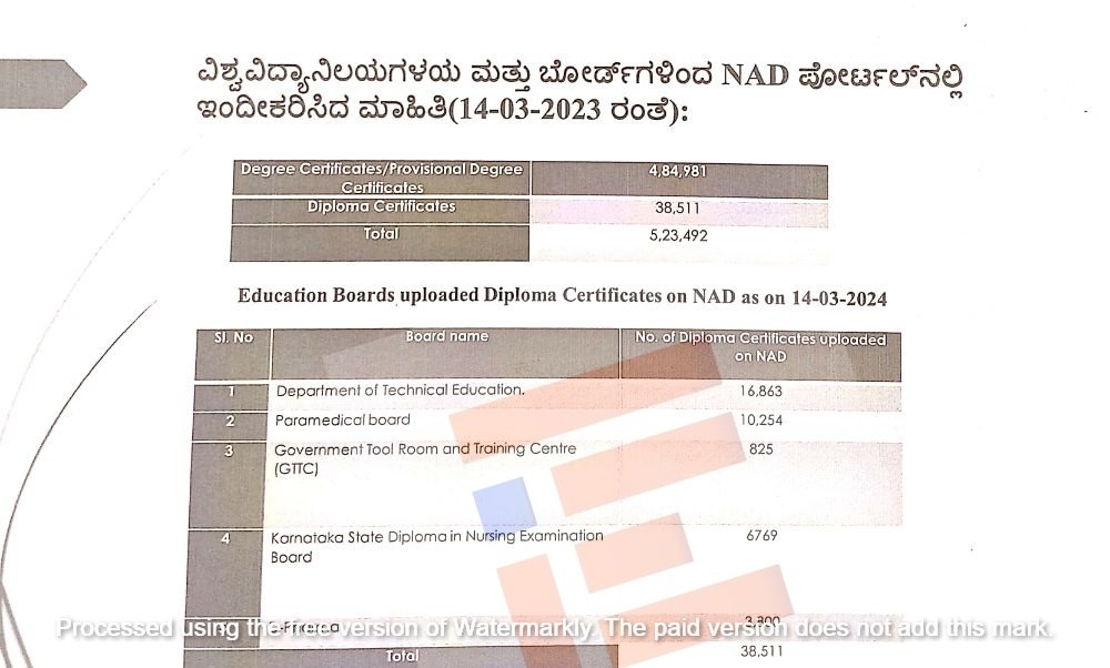38,511 ಅಭ್ಯರ್ಥಿಗಳ ಪೈಕಿ ತಾಂತ್ರಿಕ ಶಿಕ್ಷಣ ಇಲಾಖೆಯು 16,863, ಪ್ಯಾರಾ ಮೆಡಿಕಲ್ ಬೋರ್ಡ್ 10,254, ಜಿಟಿಟಿಸಿ 825, ಕರ್ನಾಟಕ ನರ್ಸಿಂಗ್ ಡಿಪ್ಲೋಮಾ ಪರೀಕ್ಷಾ ಮಂಡಳಿಯು 6,769, ಡಿ ಫಾರ್ಮಾದ 3,800 ಅಭ್ಯರ್ಥಿಗಳಿದ್ದಾರೆ.ಪದವೀಧರರ ಪೈಕಿ 4,84,981 ಅಭ್ಯರ್ಥಿಗಳು ಸೇರಿ ಒಟ್ಟಾರೆ 5,23, 492 ಅಭ್ಯರ್ಥಿಗಳ ಪ್ರಮಾಣ ಪತ್ರಗಳು ನ್ಯಾಡ್ ಪೋರ್ಟಲ್ನಲ್ಲಿ ಅಪ್ಲೋಡ್ ಆಗಿರುವುದು ತಿಳಿದು ಬಂದಿದೆ.