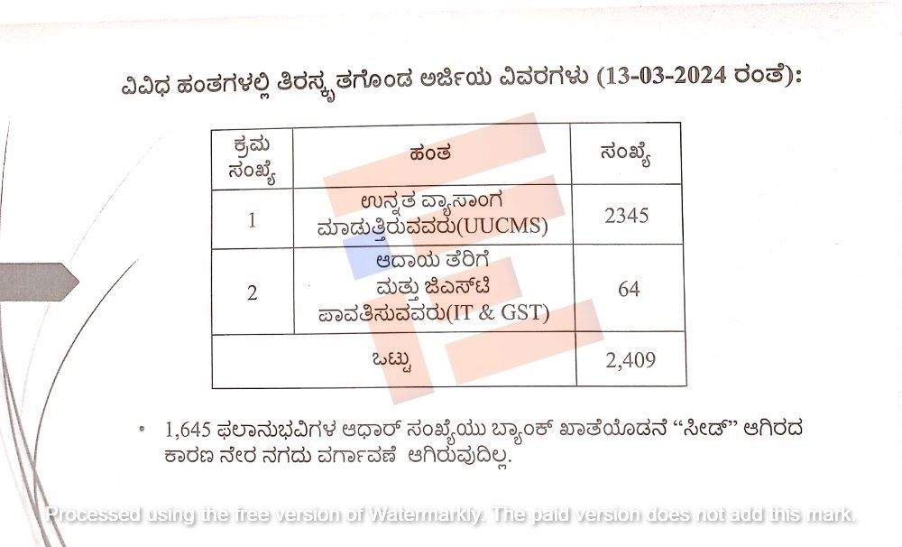 ವಿವಿಧ ಹಂತಗಳಲ್ಲಿ ಒಟ್ಟಾರೆ 2,409 ಅಭ್ಯರ್ಥಿಗಳ ಅರ್ಜಿಗಳು ತಿರಸ್ಕೃತಗೊಂಡಿವೆ. ಆಧಾರ ಸಂಖ್ಯೆಯು ಬ್ಯಾಂಕ್ ಖಾತೆಯೊಡನೆ ಸೀಡ್ ಆಗಿರದ ಕಾರಣ 1,645 ಫಲಾನುಭವಿಗಳಿಗೆ ನೇರ ನಗದು ವರ್ಗಾವಣೆಯಾಗಿಲ್ಲ ಎಂಬುದು ತಿಳಿದು ಬಂದಿದೆ.