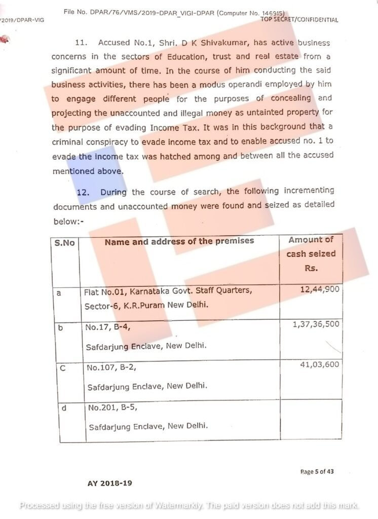 ಆದಾಯ ತೆರಿಗೆ ಇಲಾಖೆ ಅಧಿಕಾರಿಗಳು ದೆಹಲಿಯಲ್ಲಿ ಡಿ ಕೆ ಶಿವಕುಮಾರ್ ಅವರಿಗೆ ಸೇರಿದೆ ಎನ್ನಲಾಗಿದ್ದ ಮನೆಗಳ ಮೇಲೆ ದಾಳಿ ಮಾಡಿದ್ದರು. ಈ ಸಂದರ್ಭದಲ್ಲಿ ಲೆಕ್ಕಕ್ಕೆ ಸಿಗದ 12,44,900 ರು., 1,37,36,500 ಕೋಟಿ ಮತ್ತು 41,03,600 ರು. ಸಿಕ್ಕಿತ್ತು. ಇದು ಅನಧಿಕೃತವಾದ ಹಣವಾಗಿತ್ತು ಎಂದು ಆದಾಯ ತೆರಿಗೆ ಇಲಾಖೆ ಅಧಿಕಾರಿಗಳು ವಿವರಿಸಿದ್ದಾರೆ.