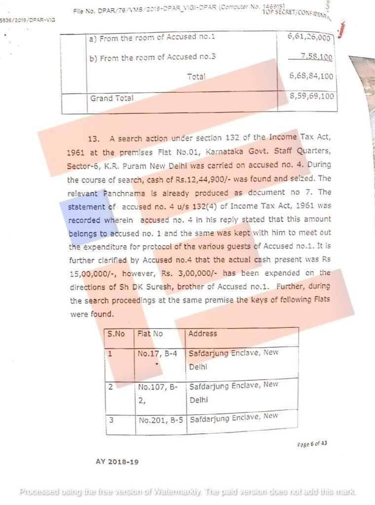 ಮೊದಲನೇ ಆರೋಪಿ ಡಿ ಕೆ ಶಿವಕುಮಾರ್ ಅವರ ಸೂಚನೆ ಮೇರೆಗೆ ನಾಲ್ಕನೇ ಆರೋಪಿ ಬಳಿಯೇ ಫ್ಲಾಟ್ಗಳ ಬೀಗದ ಕೈಗಳು ಇದ್ದವು ಎಂದು ವಿವರಿಸಲಾಗಿದೆ.