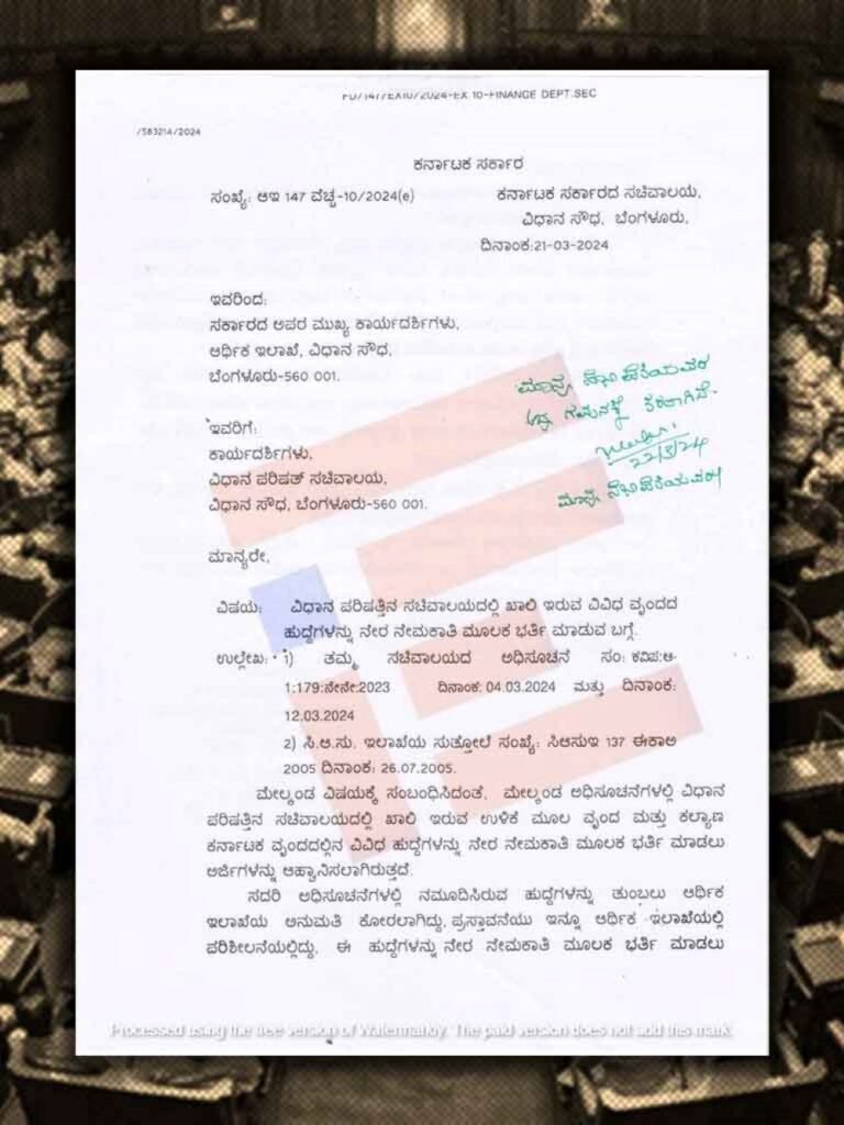 ನೇಮಕಾತಿ ಸಂಬಂಧ ಅನುಮತಿ ಕೋರಿದ್ದ ಪ್ರಸ್ತಾವನೆಯು ಆರ್ಥಿಕ ಇಲಾಖೆಯ ಪರಿಶೀಲನೆ ಹಂತದಲ್ಲಿರುವಾಗಲೇ ವಿಧಾನ ಪರಿಷತ್ ಸಚಿವಾಲಯವು ಅಧಿಸೂಚನೆ ಹೊರಡಿಸಿತ್ತು. ಹೀಗಾಗಿ ಅಧಿಸೂಚನೆಯನ್ನು ಹಿಂಪಡೆದುಕೊಳ್ಳಬೇಕು ಎಂದು ಆರ್ಥಿಕ ಇಲಾಖೆಯು ವಿಧಾನ ಪರಿಷತ್ ಸಚಿವಾಲಯಕ್ಕೆ ನಿರ್ದೇಶನ ನೀಡಿದೆ.