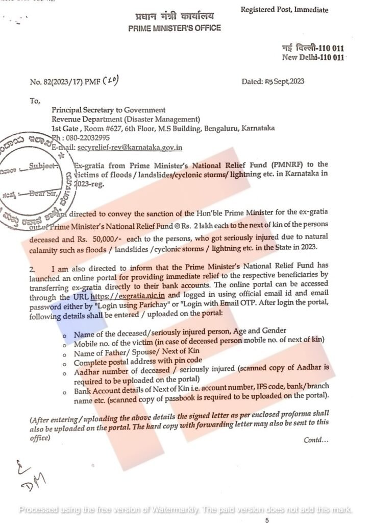 2023ನೇ ಸಾಲಿನಲ್ಲಿ ಪ್ರಕೃತಿ ವಿಕೋಪಗಳಾದ ಪ್ರವಾಹ, ಭೂ ಕುಸಿತ, ಸೈಕ್ಲೋನ್, ಬೆಂಕಿ ದುರಂತಗಳಿಂದ ಮರಣ ಹೊಂದಿದ ವಾರಸುದಾರರಿಗೆ ಪ್ರಧಾನ ಮಂತ್ರಿ ರಾಷ್ಟ್ರೀಯ ಪರಿಹಾರ ನಿಧಿ (ಪಿಎಂಎನ್ಆರ್ಎಫ್)ದಂತೆ ತಲಾ 2.00 ಲಕ್ಷದಂತೆ ಹಾಗೂ ಗಾಯಗೊಂಡವರಿಗೆ ತಲಾ 50,000 ರು.ನಂತೆ ಪರಿಹಾರ ಪಾವತಿಸಲು ತೀರ್ಮಾನಿಸಲಾಗಿದೆ. ಪರಿಹಾರ ಮೊತ್ತವನ್ನು ನೇರವಾಗಿ ಫಲಾನುಭವಿಗಳ ಬ್ಯಾಂಕ್ ಖಾತೆಗೆ ಜಮೆ ಆಡುವ ಉದ್ದೇಶದಿಂದ https;//exgratia.nic.in ರಡಿ ಲಾಗಿನ್ ಆಗಿ ಮಾಹಿತಿಗಳನ್ನು ಅಳವಡಿಸಬೇಕು.