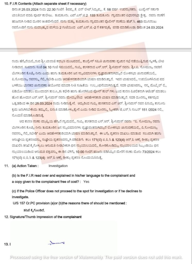 ಈ ದೂರನ್ನು ಪರಿಶೀಲಿಸಿದ್ದ ತುಮಕೂರು ಗ್ರಾಮಾಂತರ ಪೊಲೀಸ್‌ ಠಾಣೆಯಲ್ಲಿ ಎಫ್‌ಐಆರ್‍‌ ದಾಖಲಾಗಿದೆ. ಇವರ ವಿರುದ್ಧ ಅಸಂಜ್ಞೆಯ ಪ್ರಕರಣವನ್ನು ಸಂಜ್ಞೆಯ ಪ್ರಕರಣವನ್ನಾಗಿ ಪರಿವರ್ತಿಸಿ ಕಲಂ 171 (ಜಿ)ಐಪಿಸಿ 123(4) ಆರ್‍‌ ಪಿ ಆಕ್ಟ ಪ್ರಕರಣ ದಾಖಲಿಸಿ ತನಿಖೆ ಕೈಗೊಂಡಿರುವುದು ಎಫ್‌ಐಆರ್‍‌ನಿಂದ ಗೊತ್ತಾಗಿದೆ.