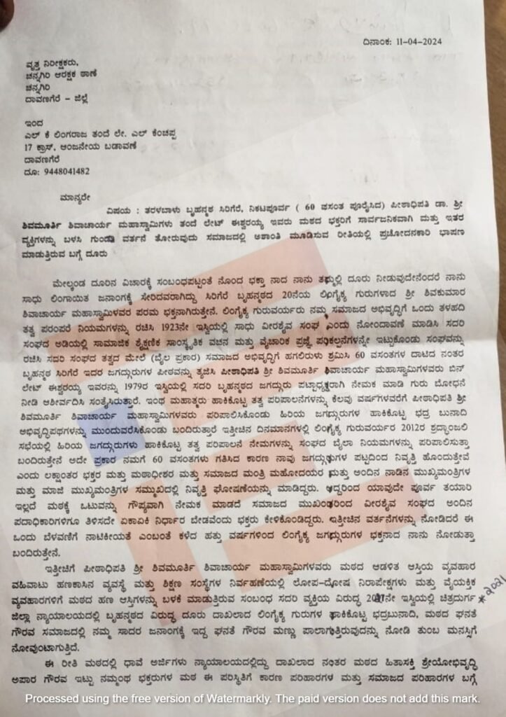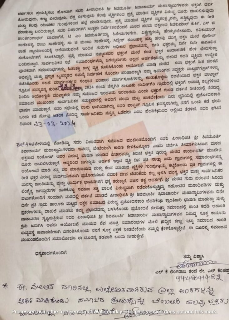 ‘ಸಮಾಜದಲ್ಲಿ ಶಾಂತಿ ಕದಡಿ ಅಶಾಂತಿ ವಾತಾವರಣ ಸೃಷ್ಟಿಸುತ್ತಿರುವ ಪೀಠಾಧಿಪತಿ ಶಿವಮೂರ್ತಿ ಶಿವಾಚಾರ್ಯ ಮಹಾಸ್ವಾಮಿಗಳ ವಿರುದ್ಧ ಸೂಕ್ತ ಕಾನೂನು ಕ್ರಮ ಜರುಗಿಸಬೇಕು. ಅವರು ಆಯೋಜನೆ ಮಾಡುವ ನೆಪ ಮಾತ್ರ ಸಮಾರಂಭಗಳ ಮೇಲೆ ಹದ್ದಿನ ಕಣ್ಣಿಟ್ಟು ಸಮಾಜದ ಶಾಂತಿ ಸುವ್ಯವಸ್ಥೆ ಕಾಪಾಡಬೇಕು,’ ಎಂದು ದೂರುದಾರ ಲಿಂಗರಾಜು ಅವರು ಕೋರಿರುವುದು ತಿಳಿದು ಬಂದಿದೆ.