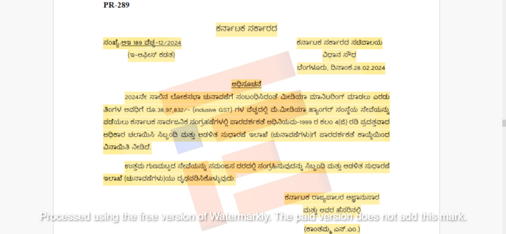 2024ನೇ ಸಾಲಿನ ಲೋಕಸಭೆ ಚುನಾವಣೆ ಸಂಬಂಧಿಸಿದಂತೆ ಮೀಡಿಯಾ ಮಾನಿಟರಿಂಗ್ ಮಾಡಲು 2 ತಿಂಗಳ ಅಧಿಗೆ 38,97,832 (ಜಿಎಸ್ಟಿ ಒಳಗೊಂಡಂತೆ) ವೆಚ್ಚದಲ್ಲಿ ಮೀಡಿಯಾ ಹ್ಯಾಂಗರ್ ಸಂಸ್ಥೆಯ ಸೇವೆಯನ್ನು ಪಡೆಯಲು ಕರ್ನಾಟಕ ಸಾರ್ವಜನಿಕ ಸಂಗ್ರಹಣೆಗಳಲ್ಲಿ ಪಾರದರ್ಶಕತೆ ಅಧಿನಿಯಮ 1999ರ ಕಲಂ 4(ಜಿ) ರಡಿ ವಿನಾಯಿತಿ ನೀಡಿರುವುದು 2024ರ ಫೆ.28ರಂದು ಹೊರಡಿಸಿರುವ ಅಧಿಸೂಚನೆಯಿಂದ ಗೊತ್ತಾಗಿದೆ.