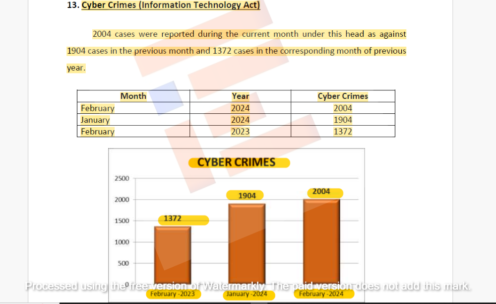 ಸೈಬರ್ ಅಪರಾಧಕ್ಕೆ ಸಂಬಂಧಿಸಿದಂತೆ 2024ರ ಜನವರಿಯಲ್ಲಿ 1,904 ಪ್ರಕರಣಗಳು ಇದ್ದರೇ 2024ರ ಫೆಬ್ರುವರಿಯಲ್ಲಿ 2,004 ಪ್ರಕರಣಗಳು ವರದಿಯಾಗಿವೆ. 2023ರ ಫೆಬ್ರುವರಿಯಲ್ಲಿ 1,372 ಪ್ರಕರಣಗಳು ವರದಿಯಾಗಿದ್ದವು. ಜನವರಿ 2024ಕ್ಕೆ ಹೋಲಿಸಿದರೆ ಫೆಬ್ರುವರಿಯ6ಲ್ಲಿ ಏರಿಕೆ ಕಂಡಿರುವುದು ತಿಳಿದು ಬಂದಿದೆ.
