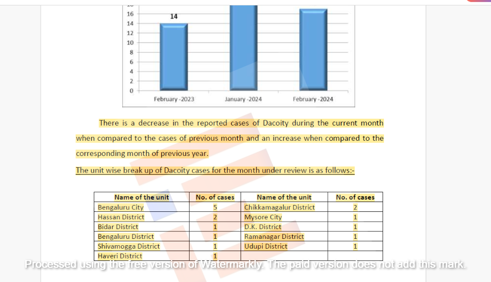 2023ರ ಫೆಬ್ರುವರಿಯಲ್ಲಿ 14 ಪ್ರಕರಣಗಳು ವರದಿಯಾಗಿದ್ದವು. ಜನವರಿ 2024ಕ್ಕೆ ಹೋಲಿಸಿದರೆ ಫೆಬ್ರುವರಿಯಲ್ಲಿ ಡಕಾಯಿತಿ ಪ್ರಕರಣಗಳು ಸಂಖ್ಯೆ ಸ್ವಲ್ಪಮಟ್ಟಿಗೆ ಇಳಿಕೆಯಾಗಿವೆ.