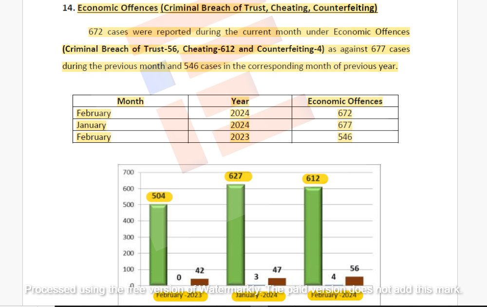 ಆರ್ಥಿಕ ಅಪರಾಧ ಪ್ರಕರಣಗಳ ಸಂಖ್ಯೆಯಲ್ಲೂ ಏರಿಕೆ ಕಂಡಿವೆ. 2024ರ ಜನವರಿಯಲ್ಲಿ 677, ಫೆಬ್ರುವರಿಯಲ್ಲಿ 672 ಪ್ರಕರಣಗಳು ವರದಿಯಾಗಿವೆ. ಫೆಬ್ರುವರಿ 2023ರಲ್ಲಿ 546 ಪ್ರಕರಣಗಳು ವರದಿಯಾಗಿದ್ದವು.