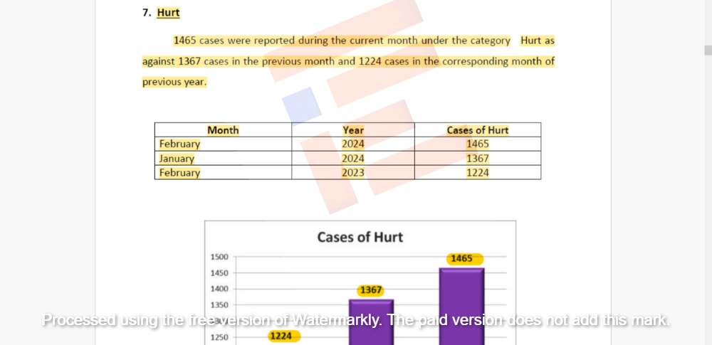 2024ರ ಜನವರಿಯಲ್ಲಿ 1,367 ನೋವುಂಟು ಮಾಡಿದ (HURT) ಪ್ರಕರಣಗಳು ಇದ್ದರೇ ಫೆಬ್ರುವರಿಯಲ್ಲಿ 1,465 ಇದೆ. ಫೆಬ್ರುವರಿ 2023ರಲ್ಲಿ 1,224 ಪ್ರಕರಣಗಳು ವರದಿಯಾಗಿದ್ದವು. 2024ರ ಜನವರಿಗೆ ಹೋಲಿಸಿದರೆ ಫೆಬ್ರುವರಿ 2024ರಲ್ಲಿ ಏರಿಕೆ ಕಂಡಿವೆ.