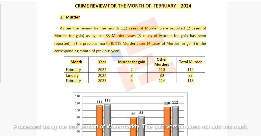 2024ರ ಫೆಬ್ರುವರಿ ಅಂತ್ಯಕ್ಕೆ 112, ಜನವರಿ ಅಂತ್ಯಕ್ಕೆ 83 ಕೊಲೆ ಪ್ರಕರಣಗಳು ವರದಿಯಾಗಿದ್ದವು. 2023ರ ಫೆಬ್ರುವರಿಯಲ್ಲಿ 118 ಕೊಲೆ ಪ್ರಕರಣಗಳು ವರದಿಯಾಗಿದ್ದವು. 2024ರ ಜನವರಿ ಗೆ ಹೋಲಿಸಿದರೆ ಫೆಬ್ರುವರಿಯಲ್ಲಿ ಕೊಲೆ ಪ್ರಕರಣಗಳ ಸಂಖ್ಯೆ ಏರಿಕೆ ಕಂಡಿದೆ.