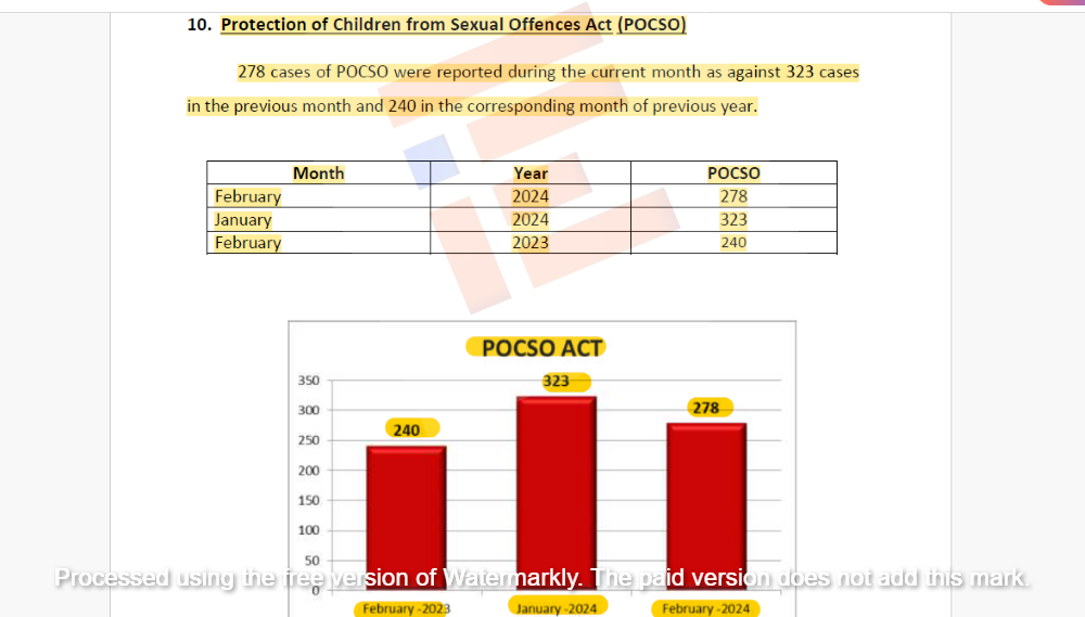 ಜನವರಿ 2024ರಲ್ಲಿ 323, ಫೆಬ್ರುವರಿ 2024ರಲ್ಲಿ 278 ಪೋಕ್ಸೋ ಪ್ರಕರಣಗಳು ವರದಿಯಾಗಿದ್ದವು. 2023ರ ಫೆಬ್ರುವರಿಯಲ್ಲಿ 240 ಪ್ರಕರಣಗಳು ವರದಿಯಾಗಿದ್ದವು. ಹಿಂದಿನ ಸರ್ಕಾರಕ್ಕೆ ಹೋಲಿಸಿದರೆ ಪ್ರಸಕ್ತ ವರ್ಷದ 2 ತಿಂಗಳಲ್ಲಿ ಪೋಕ್ಸೋ ಪ್ರಕರಣಗಳ ಸಂಖ್ಯೆಯಲ್ಲಿ ಏರಿಕೆ ಕಂಡಿವೆ.