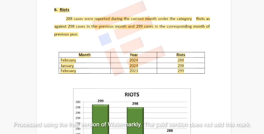 2024ರ ಜನವರಿಯಲ್ಲಿ 298 ದಂಗೆ ಪ್ರಕರಣಗಳು ವರದಿಯಾಗಿದ್ದರೇ ಫೆಬ್ರುವರಿಯಲ್ಲಿ 288 ಪ್ರಕರಣಗಳು ವರದಿಯಾಗಿವೆ. 2023ರ ಫೆಬ್ರುವರಿಯಲ್ಲಿ 299 ಪ್ರಕರಣಗಳು ವರದಿಯಾಗಿದ್ದವು.