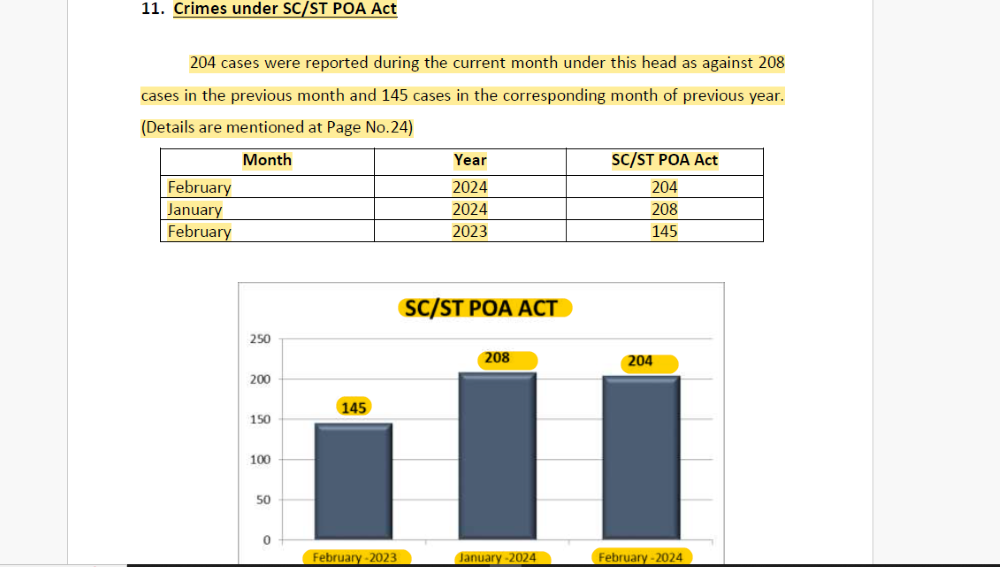 ಎಸ್ಸಿ, ಎಸ್ಟಿ ಮತ್ತು ಪಿಒಎ ಕಾಯ್ದೆಯಡಿಯಲ್ಲಿ 2024ರ ಜನವರಿಯಲ್ಲಿ 208 ಪ್ರಕರಣಗಳು ವರದಿಯಾಗಿದ್ದರೇ ಫೆಬ್ರುವರಿ 2024ರಲ್ಲಿ 204 ಪ್ರಕರಣಗಳು ವರದಿಯಾಗಿವೆ. 2023 ಫೆಬ್ರುವರಿಯಲ್ಲಿ 145 ಪ್ರಕರಣಗಳು ವರದಿಯಾಗಿವೆ. ಹಿಂದಿನ ಬಿಜೆಪಿ ಸರ್ಕಾರಕ್ಕೆ ಹೋಲಿಸಿದರೆ ಈಗಿನ ಸರ್ಕಾರಕ್ಕೆ ಹೋಲಿಸಿದರೆ ಏರಿಕೆ ಕಂಡಿರುವುದು ಗೊತ್ತಾಗಿದೆ.