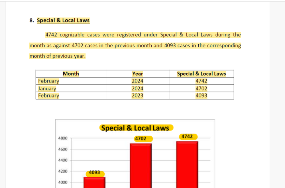 ವಿಶೇಷ ಮತ್ತು ಸ್ಥಳೀಯ ಕಾನೂನುಗಳನ್ನು ಉಲ್ಲಂಘಿಸಿರುವ ಪ್ರಕರಣಗಳಿಗೆ ಸಂಬಂಧಿಸಿದಂತೆ 2024ರ ಜನವರಿಯಲ್ಲಿ 4,702 ಪ್ರಕರಣಗಳು ದಾಖಲಾಗಿದ್ದವು. ಫೆಬ್ರುವರಿಯಲ್ಲಿ 4,742 ಪ್ರಕರಣಗಳು ವರದಿಯಾಗುವ ಮೂಲಕ ಈ ವಿಭಾಗದಲ್ಲಿ ಏರಿಕೆ ಕಂಡಿದೆ.
