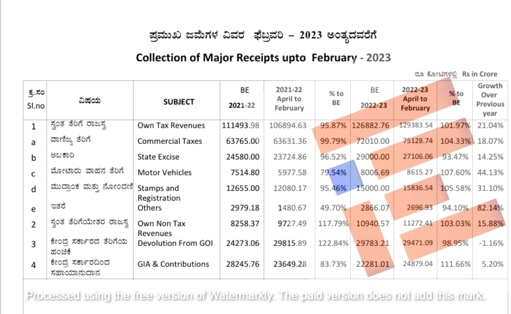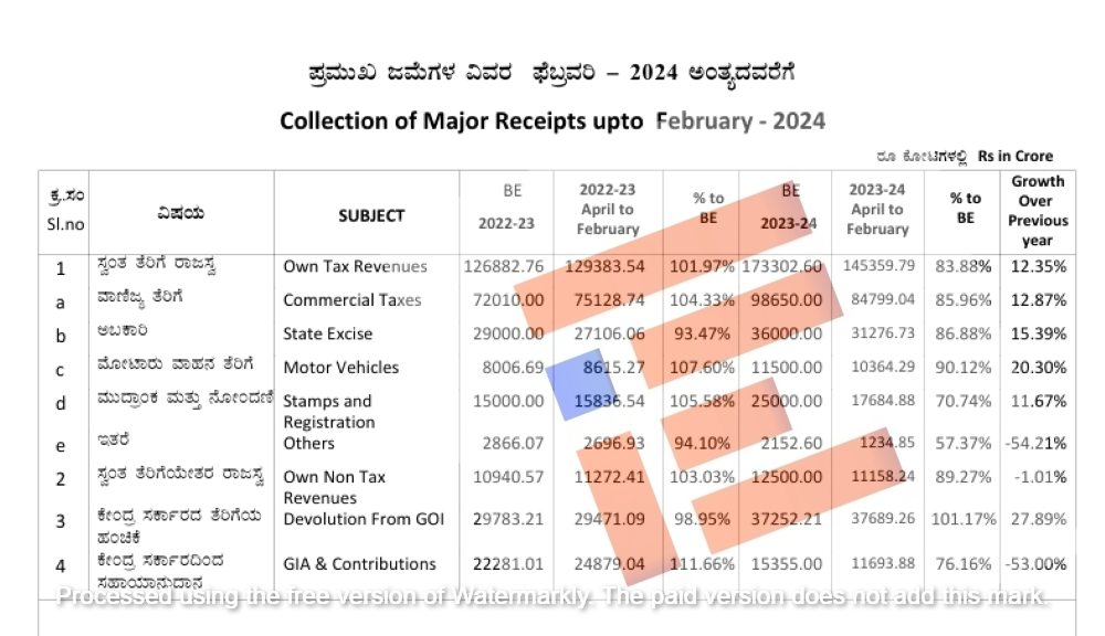 ಸ್ವಂತ ತೆರಿಗೆ ರಾಜಸ್ವ, ವಾಣಿಜ್ಯ ತೆರಿಗೆ, ಅಬಕಾರಿ, ಮೋಟಾರು ವಾಹನ ತೆರಿಗೆ, ಮುದ್ರಾಂಕ ನೋಂದಣಿ, ಇತರೆ ಮತ್ತು ಸ್ವಂತ ತೆರಿಗೆಯೇತರ ರಾಜಸ್ವ ವಿಭಾಗದಲ್ಲಿ ಒಟ್ಟಾರೆ 3,59,105.2 ಕೋಟಿ ರು. ನಷ್ಟು ಗುರಿ ನಿಗದಿಪಡಿಸಿತ್ತು. ಆದರೆ ಫೆಬ್ರುವರಿ ಅಂತ್ಯಕ್ಕೆ 3,01,827.85 ಕೋಟಿ ರು. ಸಂಗ್ರಹವಾಗಿದೆ.  ನಿಗದಿತ ಗುರಿ ಮುಟ್ಟದ ಕಾರಣ 57,227.38 ಕೋಟಿ ರು.ನಷ್ಟು ಕುಸಿತ ಕಂಡಿದೆ ಎಂಬುದು ಮೇಲ್ನೋಟಕ್ಕೆ ಕಂಡುಬಂದಿದೆ.