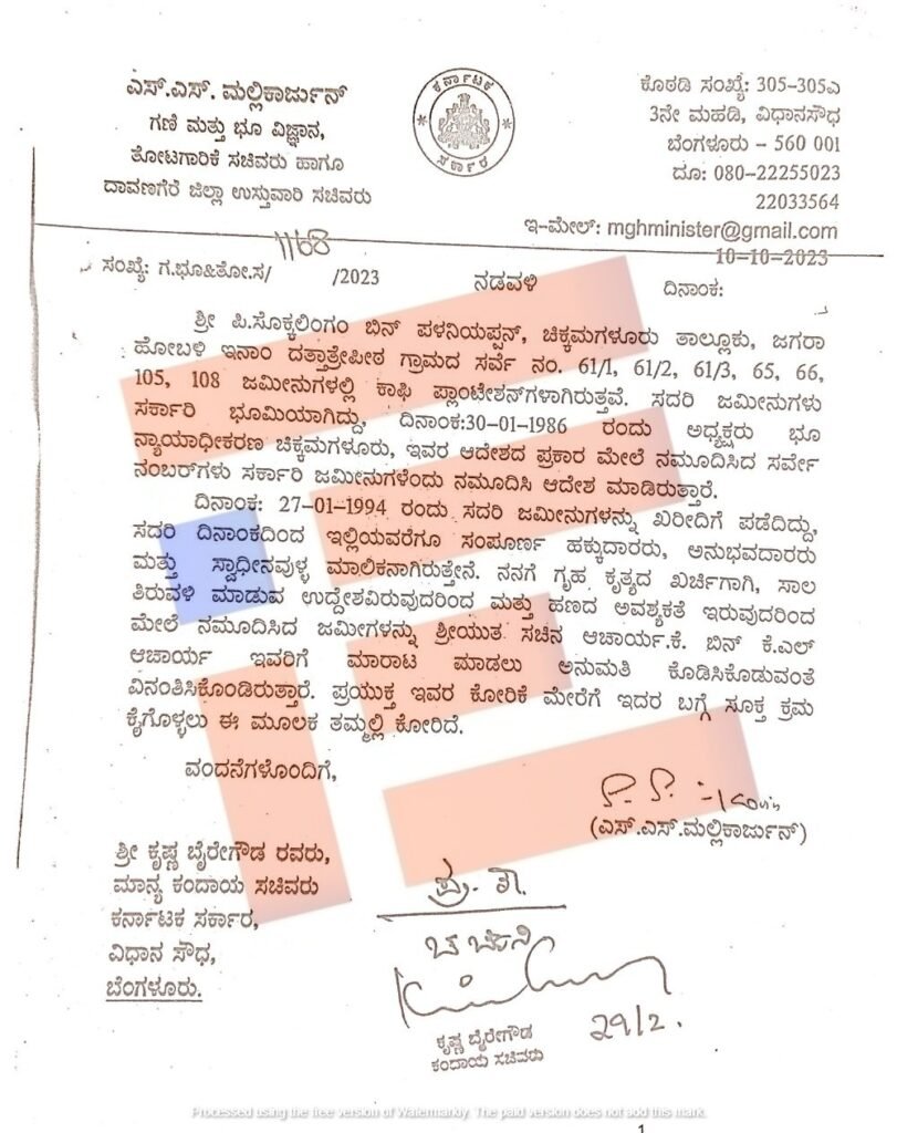 ಈ ಪತ್ರವನ್ನು ಆಧರಿಸಿ ಸಚಿವ ಎಸ್‌ ಎಸ್‌ ಮಲ್ಲಿಕಾರ್ಜುನ್‌ ಅವರು ಕಂದಾಯ ಸಚಿವ ಕೃಷ್ಣಬೈರೇಗೌಡ ಅವರಿಗೆ ಪತ್ರ ಬರೆದಿದ್ದಾರೆ. ಈ ಪತ್ರದ ಮೇಲೆಯೇ ಸಚಿವ ಕೃಷ್ಣ ಬೈರೇಗೌಡ ಅವರು ಚರ್ಚಿಸಿ ಎಂದು ಸೂಚಿಸಿರುವುದು ಪತ್ರದಿಂದ ಗೊತ್ತಾಗಿದೆ.