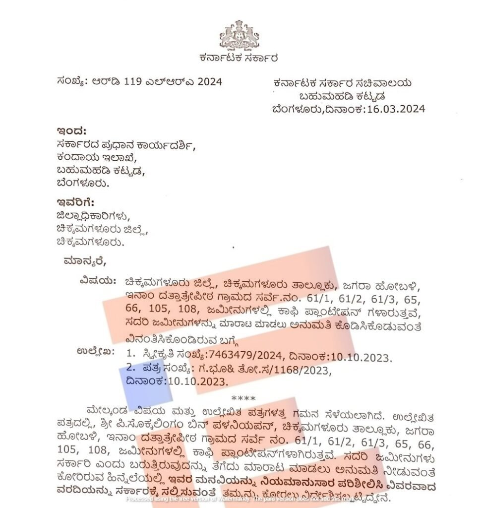 ಈ ಪತ್ರವನ್ನಾಧರಿಸಿ ವಿವರವಾದ ವರದಿಯನ್ನು ಸಲ್ಲಿಸಬೇಕು ಎಂದು ಕಂದಾಯ ಇಲಾಖೆಯು 2024ರ ಮಾರ್ಚ್‌ 16ರಂದು ಪತ್ರ ಬರೆದಿದೆ. ಈ ಪತ್ರಗಳು ಮತ್ತು ಜಮೀನಿಗೆ ಸಂಬಂಧಿಸಿದ ಆರ್‍‌ಟಿಸಿ ಪಹಣಿ ದಾಖಲೆಗಳು ‘ದಿ ಫೈಲ್‌’ಗೆ ಲಭ್ಯವಾಗಿವೆ.