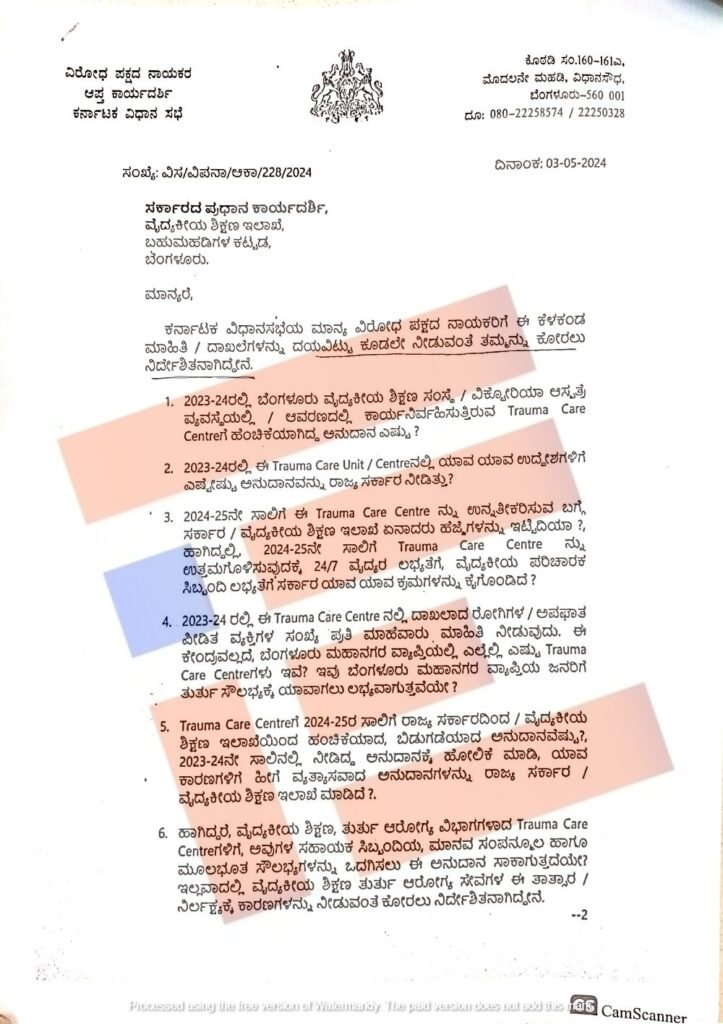 ಬೆಂಗಳೂರು;  ಬೆಂಗಳೂರು ವೈದ್ಯಕೀಯ ಮಹಾವಿದ್ಯಾಲಯ ಮತ್ತು ಸಂಶೋಧನಾ ಸಂಸ್ಥೆಯ ಟ್ರಾಮ ಕೇರ್‍‌ ಕೇಂದ್ರಕ್ಕೆ ರಾಜ್ಯ ಕಾಂಗ್ರೆಸ್‌ ಸರ್ಕಾರವು  ಅನುದಾನ ಕಡಿತಗೊಳಿಸಿರುವ ಬೆನ್ನಲ್ಲೇ ಪ್ರತಿಪಕ್ಷ ನಾಯಕ ಆರ್‍‌ ಅಶೋಕ್‌ ಅವರು ಇದೀಗ ಟ್ರಾಮಾ ಕೇಂದ್ರಗಳ ಆರ್ಥಿಕ ಸ್ಥಿತಿ ಕುರಿತು ಮಾಹಿತಿ ಕೋರಿ ವೈದ್ಯಕೀಯ ಶಿಕ್ಷಣ ಇಲಾಖೆಯ ಸರ್ಕಾರದ ಪ್ರಧಾನ ಕಾರ್ಯದರ್ಶಿಗೆ ಪತ್ರ ಬರೆದಿದ್ದಾರೆ.