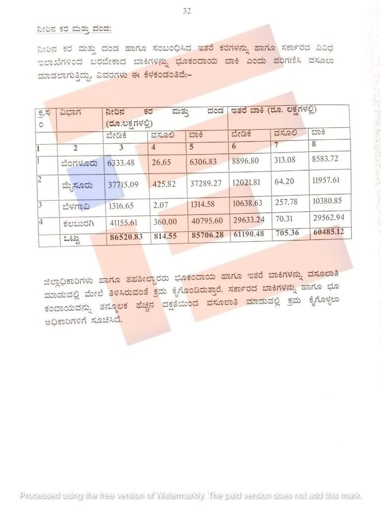 ಮೈಸೂರು ವಿಭಾಗದಲ್ಲಿ 120.21 ಕೋಟಿ ರು ಬೇಡಿಕೆ ಪೈಕಿ 64.20 ಲಕ್ಷ ರು ಮಾತ್ರ ವಸೂಲಾಗಿದೆ.  119.57 ಕೋಟಿ ರು ಬಾಕಿ ಇದೆ. ಬೆಳಗಾವಿ ವಿಭಾಗದಲ್ಲಿ 106.38 ಕೋಟಿ ರು ಬೇಡಿಕೆ ಪೈಕಿ 2.57 ಕೋಟಿ ವಸೂಲಾಗಿದ್ದು ಇನ್ನೂ 103.80 ಕೋಟಿ ರು ವಸೂಲಾತಿಗೆ ಬಾಕಿ ಇದೆ. ಕಲ್ಬುರ್ಗಿ ವಿಭಾಗದಲ್ಲಿ 296.33 ಕೋಟಿ ರು ಬೇಡಿಕೆ ಪೈಕಿ ಕೇವಲ 70.31 ಲಕ್ಷ ರು ಮಾತ್ರ ವಸೂಲಾಗಿದೆ. ಈ ಕುರಿತು ಕಂದಾಯ ಇಲಾಖೆ ಸಚಿವ ಕೃಷ್ಣಬೈರೇಗೌಡ ಅವರು ಅಧಿಕಾರಿಗಳೊಂದಿಗೆ ಚರ್ಚಿಸಿದ್ದಾರೆ ಎಂದು ತಿಳಿದು ಬಂದಿದೆ.