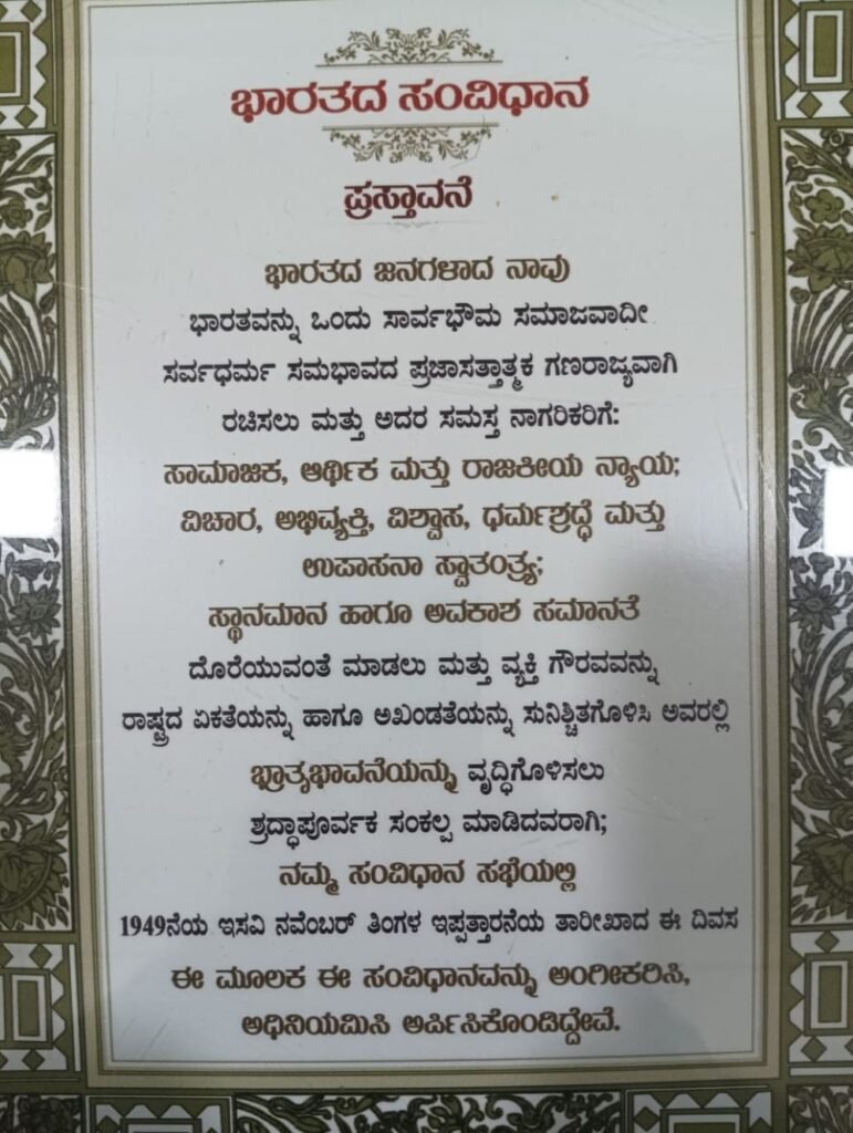 ಸಮಾಜ ಕಲ್ಯಾಣ ಇಲಾಖೆಯ ಸೂಚನೆಯಂತೆ ಈಗಾಗಲೇ ಸರ್ಕಾರದ ಎಲ್ಲಾ ಇಲಾಖೆಗಳ ಕಚೇರಿಗಳು, ಜಿಲ್ಲಾ, ತಾಲೂಕು ಮತ್ತು ಗ್ರಾಮೀಣ ಹಂತದಲ್ಲಿರುವ ಸರ್ಕಾರಿ ಕಚೇರಿಗಳಿಗೆ ಸರ್ವಧರ್ಮ ಸಮಭಾವದ ಎಂಬ ಪದವುಳ್ಳ ಸಂವಿಧಾನ ಪೀಠಿಕೆಯ ಕನ್ನಡ ಆವೃತ್ತಿಯ ಫೋಟೋಗಳನ್ನು ಅಳವಡಿಸಲಾಗಿದೆ.