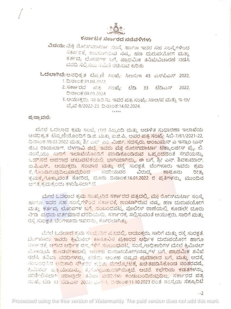 ಈ ಸಂಬಂಧ 2024ರ ಜನವರಿ 8ರಂದು ಸಾರಿಗೆ ಇಲಾಖೆಯ ಆಯುಕ್ತರಿಗೆ ಪತ್ರವನ್ನು (ಸಂಖ್ಯೆ ಟಿಡಿ 33 ಟಿಡಿಎಸ್ 2022) ಬರೆದಿದ್ದರು. ‘ರೋಸ್ಮೆರ್ಟಾ ಸಂಸ್ಥೆ ಹಾಗೂ ಇದರ ಸಹ ಸಂಸ್ಥೆಗಳಿಂದ ಸರ್ಕಾರಕ್ಕೆ ಉಂಟಾಗಿರುವ ನಷ್ಟ, ಹಣ ದುರುಪಯೋಗ ಮತ್ತು ಕರ್ತವ್ಯಲೋಪಗಳ ಬಗ್ಗೆ ಸಂಬಂಧಪಟ್ಟ ಪೊಲೀಸ್ ಠಾಣೆಯಲ್ಲಿ ಕೂಡಲೇ ದೂರು ನೀಡಿ ಪ್ರಥಮ ವರ್ತಮಾನ ವರದಿಯನ್ನು ಸರ್ಕಾರಕ್ಕೆ ಸಲ್ಲಿಸಬೇಕು,’ ಎಂದು ಸಾರಿಗೆ ಇಲಾಖೆಯು ಆಯುಕ್ತರಿಗೆ ನಿರ್ದೇಶನ ನೀಡಿದ್ದರು. ಎಫ್ಐಆರ್ ದಾಖಲಿಸುವ ಸಂಬಂಧ ಸಾರಿಗೆ ಸಚಿವ ರಾಮಲಿಂಗಾರೆಡ್ಡಿ ಅವರು ಸಹ ಅನುಮೋದನೆ ನೀಡಿದ್ದರು.