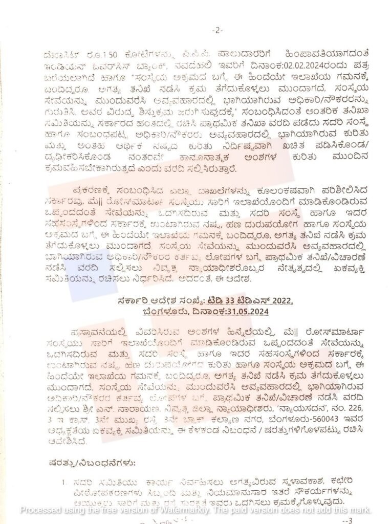 ಅಲ್ಲದೇ ಕಚೇರಿಯ ಕಡತಗಳನ್ನು ಪರಿಶೀಲಿಸಲಾಗಿ ಯಾವುದೇ ತನಿಖಾ ವರದಿಗಳು ಕಂಡುಬಂದಿರುವುದಿಲ್ಲ. ಸಂಸ್ಥೆಯ ಠೇವಣಿ 1.50 ಕೋಟಿ ರು.ಗಳನ್ನು ಪಿಪಿಪಿ ಪಾಲುದಾರರಿಗೆ ಹಿಂಪಾವತಿಯಾಗದಂತೆ ಇಂಡಿಯನ್ ಓವರ್ಸೀಸ್ ಬ್ಯಾಂಕ್ಗೆ 2024ರ ಫೆ.2ರಂದು ಪತ್ರ ಬರೆಯಲಾಗಿದೆ. ಹಾಗೂ ಸಂಸ್ಥೆಯ ಅಕ್ರಮದ ಬಗ್ಗೆ ಈ ಹಿಂದೆಯೇ ಇಲಾಖೆಯ ಗಮನಕ್ಕೆ ಬಂದಿದ್ದರೂ ಅಗತ್ಯ ತನಿಖೆ ನಡೆಸಿ ಕ್ರಮ ತೆಗೆದುಕೊಳ್ಳಲು ಮುಂದಾಗಿಲ್ಲ. ಸಂಸ್ಥೆಯ ಸೇವೆಯನ್ನು ಮುಂದುವರೆಸಲಾಗಿದೆ ಎಂದು ಆದೇಶದಲ್ಲಿ ಉಲ್ಲೇಖಿಸಲಾಗಿದೆ.