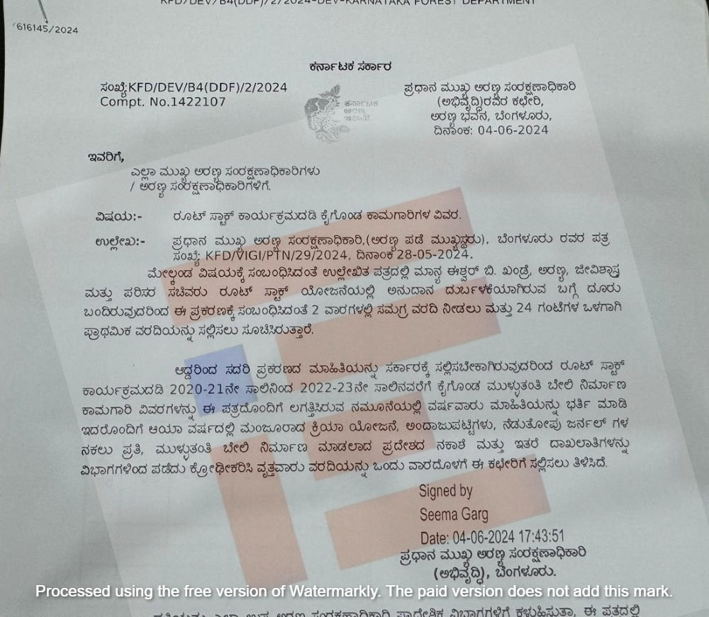ಪಿಸಿಸಿಎಫ್‌ ಅವರು ರಾಜ್ಯದ ಎಲ್ಲಾ ಮುಖ್ಯ  ಅರಣ್ಯ ಸಂರಕ್ಷಣಾಧಿಕಾರಿಗಳು ಮತ್ತು ಎಲ್ಲಾ ಅರಣ್ಯ ಸಂರಕ್ಷಣಾಧಿಕಾರಿಗಳಿಗೆ 2024ರ ಜೂನ್‌ 4ರಂದು ಪತ್ರ ಬರೆದಿದ್ದಾರೆ.