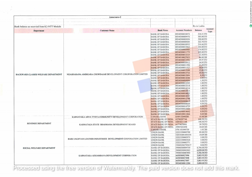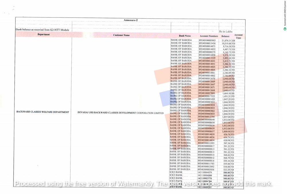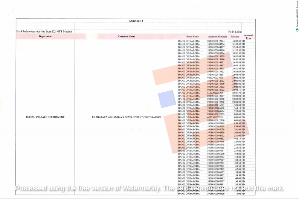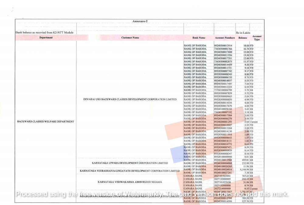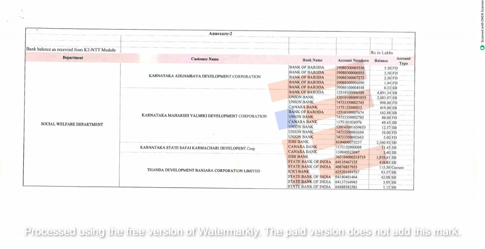 ಕರ್ನಾಟಕ ಸಫಾಯಿ ಕರ್ಮಚಾರಿ ಅಭಿವೃದ್ಧಿ ನಿಗಮವು ಕೆನರಾ ಬ್ಯಾಂಕ್‌, ಐಡಿಬಿಐ, 12.85 ಲಕ್ಷ ರು., ಕರ್ನಾಟಕ ತಾಂಡಾ ಅಭಿವೃದ್ಧಿ ನಿಗಮವು ಐಸಿಐಸಿಐ ಮತ್ತು ಎಸ್‌ಬಿಐನಲ್ಲಿ 25.93 ಕೋಟಿ ರು.ಗಳನ್ನು ಇರಿಸಿರುವುದು ಗೊತ್ತಾಗಿದೆ.