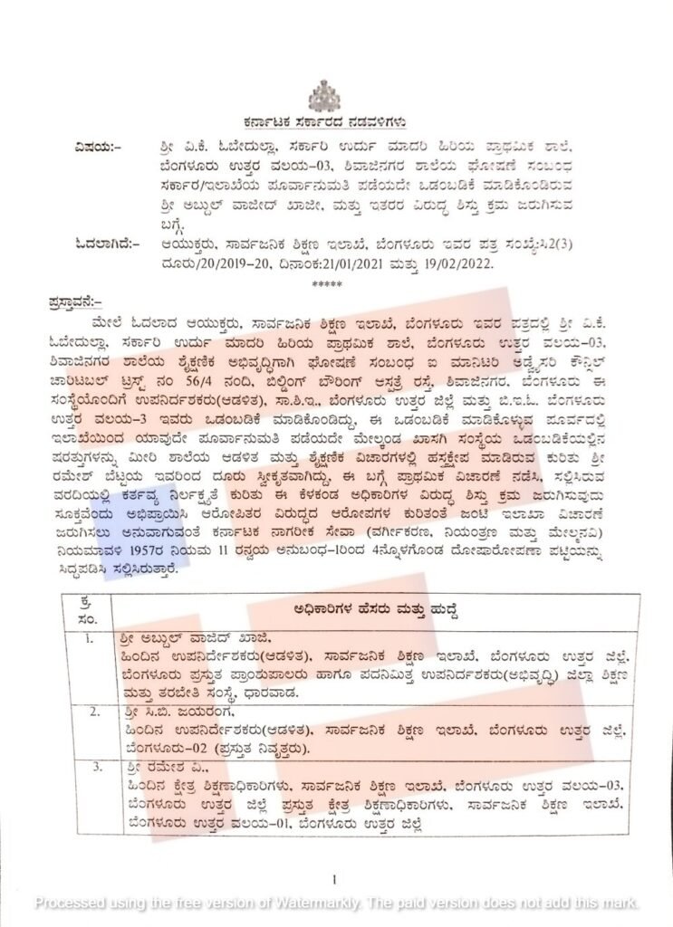 ಆರೋಪಿತ ಅಧಿಕಾರಿಗಳು ಎಸಗಿರುವ ಕರ್ತವ್ಯಲೋಪದ ವಿರುದ್ಧ ಸಲ್ಲಿಕೆಯಾಗಿರುವ ಪ್ರಾಥಮಿಕ ವಿಚಾರಣೆ ವರದಿ ಆಧರಿಸಿ ಕರ್ನಾಟಕ ನಾಗರೀಕ ಸೇವಾ ನಿಯಮಾವಳಿಗಳ 1958ರ ನಿಯಮ 214ರ ಅನ್ವಯ ಜಂಟಿ ಇಲಾಖೆ ವಿಚಾರಣೆ ನಡೆಸಲು ವಿಶೇಷ ಮಂಜೂರಾತಿ ನೀಡಿರುವ ಪ್ರಾಥಮಿಕ ಮತ್ತು ಪ್ರೌಢಶಿಕ್ಷಣ ಇಲಾಖೆಯು 2022ರ ಮಾರ್ಚ್‌ನಲ್ಲಿ ಆದೇಶ (ಸರ್ಕಾರದ ಆದೇಶ ಸಂಖ್ಯೆ; ಇಡಿ 11 ಡಿಜಿಪಿ 2021 ಬೆಂಗಳೂರು) ಹೊರಡಿಸಿತ್ತು.