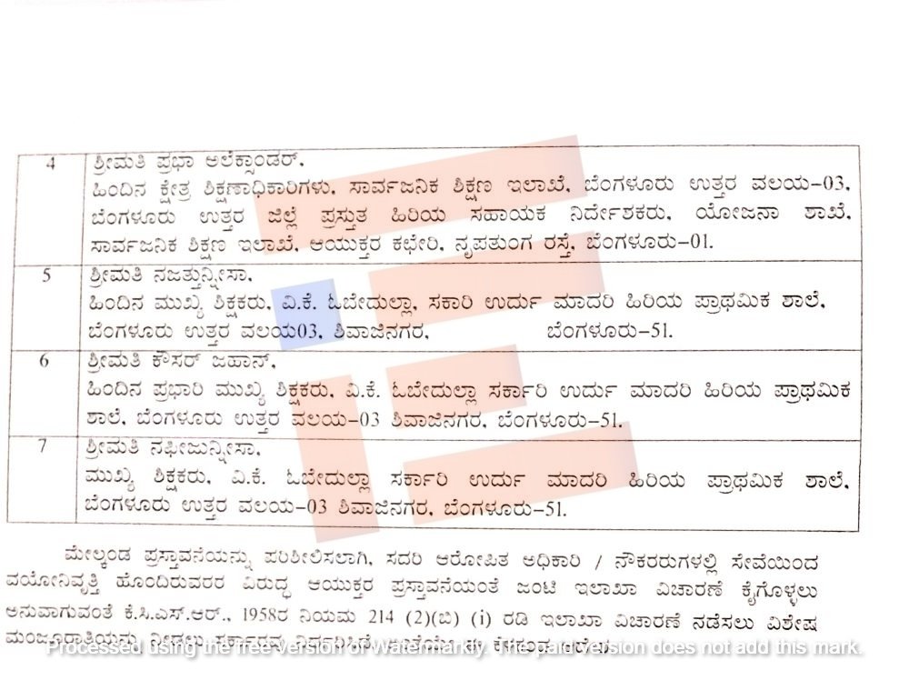 ಮುಖ್ಯ ಶಿಕ್ಷಕರಾಗಿದ್ದ  ನಜತ್ತುನ್ನೀಸಾ ಅವರ ವಿರುದ್ಧದ 2 ಆರೋಪಗಳು ಸಾಬೀತಾಗಿಲ್ಲ. ಪ್ರಭಾರಿ ಮುಖ್ಯ ಶಿಕ್ಷಕರಾಗಿದ್ದ ಕೌಸರ್‍‌ ಜಹಾನ್‌ ಅವರ ವಿರುದ್ಧದ 2 ಆರೋಪಗಳು ರುಜುವಾತುಗೊಂಡಿಲ್ಲ. ಮತ್ತೊಬ್ಬ ಮುಖ್ಯ ಶಿಕ್ಷಕರಾದ ನಫೀಜುನ್ನೀಸಾ ಅವರ ವಿರುದ್ಧದ 2 ಆರೋಪಗಳು ಸಾಬೀತಾಗಿಲ್ಲ. ಹೀಗಾಗಿ ಒಟ್ಟು 6 ಮಂದಿಯನ್ನು ಆರೋಪಗಳಿಂದ ದೋಷಮುಕ್ತಗೊಳಿಸಿ ಆದೇಶ ಹೊರಡಿಸಿರುವುದು ಗೊತ್ತಾಗಿದೆ.