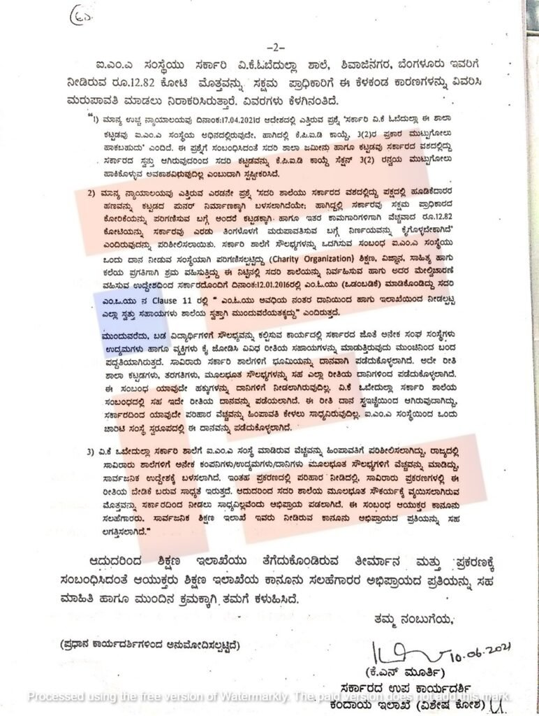ಅಲ್ಲದೆ ಶಾಲಾ ಕಟ್ಟಡಗಳು, ತರಗತಿಗಳು ಮೂಲಭೂತ ಸೌಲಭ್ಯಗಳನ್ನು ಎಲ್ಲಾ ರೀತಿಯ ದಾನಿಗಳಿಂದ ಪಡೆಯಲಾಗಿದೆ. ಈ ಸಂಬಂಧ ಯಾವುದೇ ಹಕ್ಕುಗಳನ್ನು ದಾನಿಗಳಿಗೆ ನೀಡಿಲ್ಲ. ವಿ ಕೆ ಒಬೆದುಲ್ಲಾ ಸರ್ಕಾರಿ ಶಾಲೆಯ ಪ್ರಕರಣದಲ್ಲಿಯೂ ಇದೇ ರೀತಿಯ ದಾನ ಪಡೆಯಲಾಗಿದೆ. ಈ ರೀತಿಯ ದಾನ ಸ್ವ ಇಚ್ಛೆಯಿಂದ ಪಡೆಯಲಾಗಿದೆ. ಹೀಗಾಗಿ ಸರ್ಕಾರದಿಂದ ಯಾವುದೇ ಪರಿಹಾರ ವೆಚ್ಚವನ್ನು ಹಿಂಪಾವತಿ ಕೇಳಲು ಸಾಧ್ಯವಿಲ್ಲ ಎಂದೂ ಶಿಕ್ಷಣ ಇಲಾಖೆಯು ಅಭಿಪ್ರಾಯಿಸಿತ್ತು.