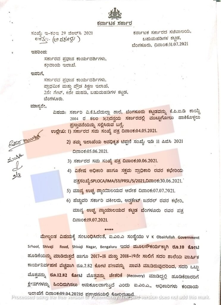 ‘2017-18 ಮತ್ತು 2018-19ನೇ ಸಾಲಿಗೆ ವಿ ಕೆ ಒಬೆದುಲ್ಲಾ ಸರ್ಕಾರಿ ಶಾಲೆಯ ಮೂಲಸೌಕರ್ಯಕ್ಕೆ 10 ಕೋಟಿ ಹೂಡಿಕೆ ಮಾಡಿರುತ್ತದೆ. ಶಾಲೆಯ ವಾರ್ಷಿಕ ಕಾರ್ಯನಿರ್ವಹಣೆ ವೆಚ್ಚವಾಗಿ 2.82 ಕೋಟಿ ಪಾವತಿ ಮಾಡಿರುವುದರಿಂದ ಒಟ್ಟು 12.82 ಕೋಟಿ ಮೊತ್ತವನ್ನು ಚೇತರಿಕೆ ಮಾಡಿದಲ್ಲಿ ಹೂಡಿಕೆದಾರರಿಗೆ ಕ್ಲೈಮ್‌ಗಳನ್ನು ಹಿಂದಿರುಗಿಸಲು ಅನುಕೂಲವಾಗುತ್ತದೆ,’ ಎಂದು ಪತ್ರದಲ್ಲಿ ಪ್ರಸ್ತಾಪಿಸಲಾಗಿತ್ತು.
